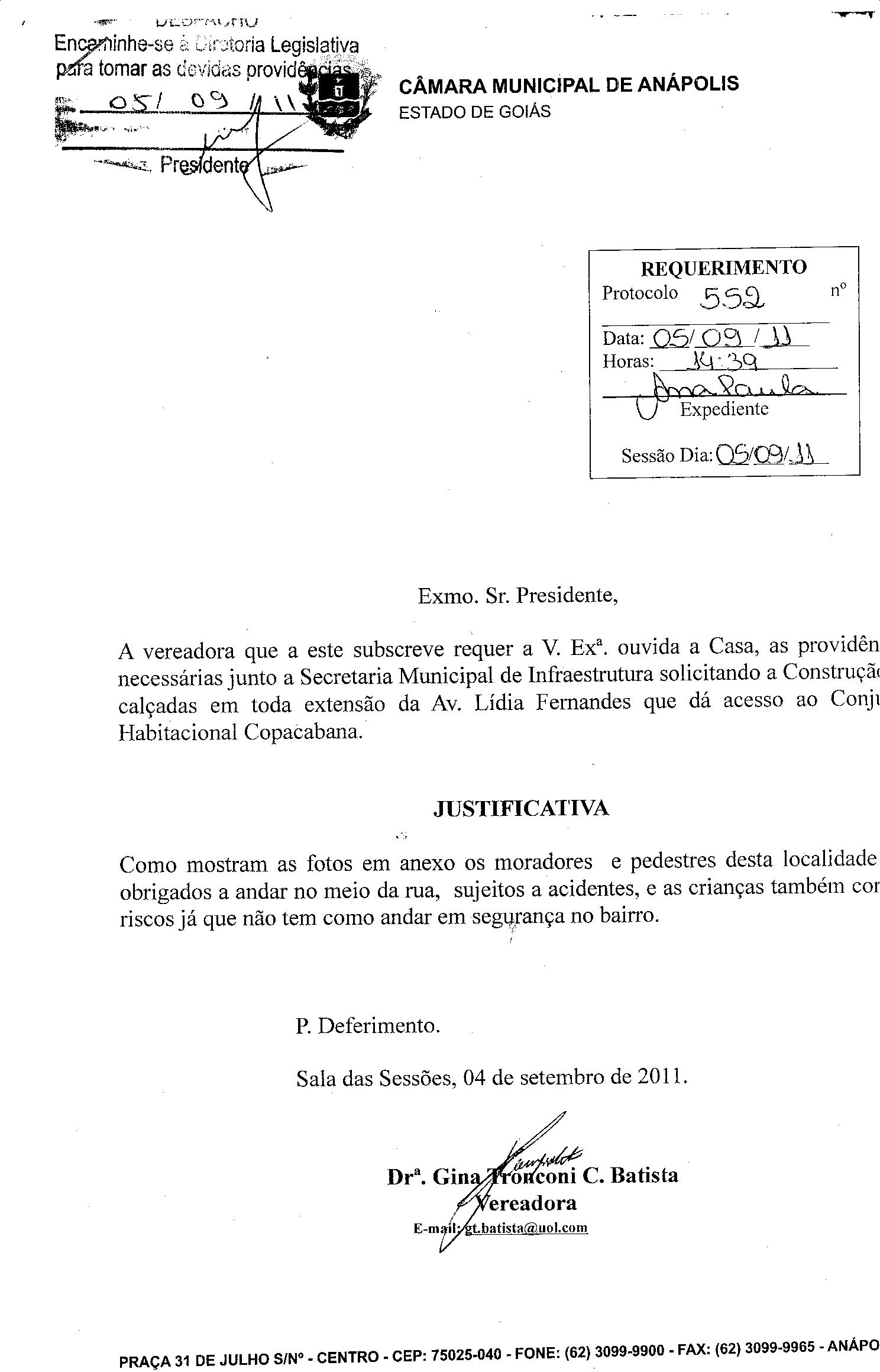 O VEREADOR, ABAIXO ASSINADO REQUER A V.EX° OUVIDA A CASA, AS PROVIDÊNCIAS NECESSÁRIAS JUNTO A SECRETARIA MUNICIPAL DE INFRAESTRUTURA SOLICITANDO A CONSTRUÇÃO DE CALÇADA EM TODA EXTENÇÃO DA AV. LÍDIA FERNANDES QUE DÁ ACESSO AO CONJUNTO HABITACIONAL COPACABANA.