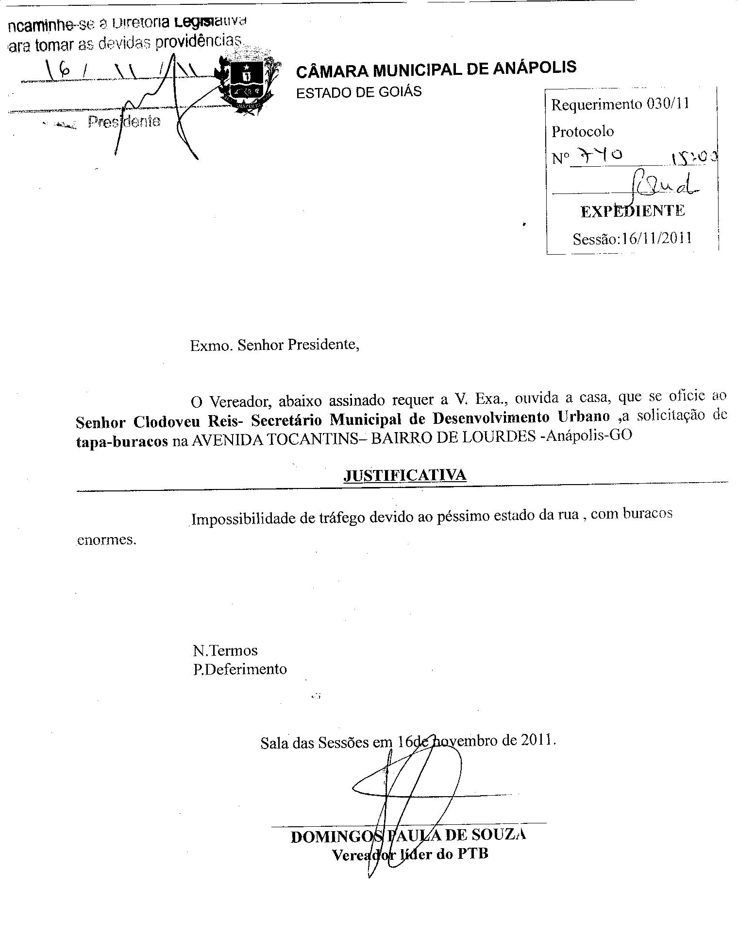 O VEREADOR, ABAIXO ASSINDAO REQUER A V.EXA., OUVIDA A CASA, QUE SE OFÍCIE AO SENHOR CLODOVEU REIS- SECRETÁRIO MUNICIPAL DE DESENVOLVIMENTO URBANO, A SOLICITAÇÃO DE TPA-BURACOS NA AVENIDA TOCANTINS - BAIRRO DE LOURDES - ANÁPOLIS-GO