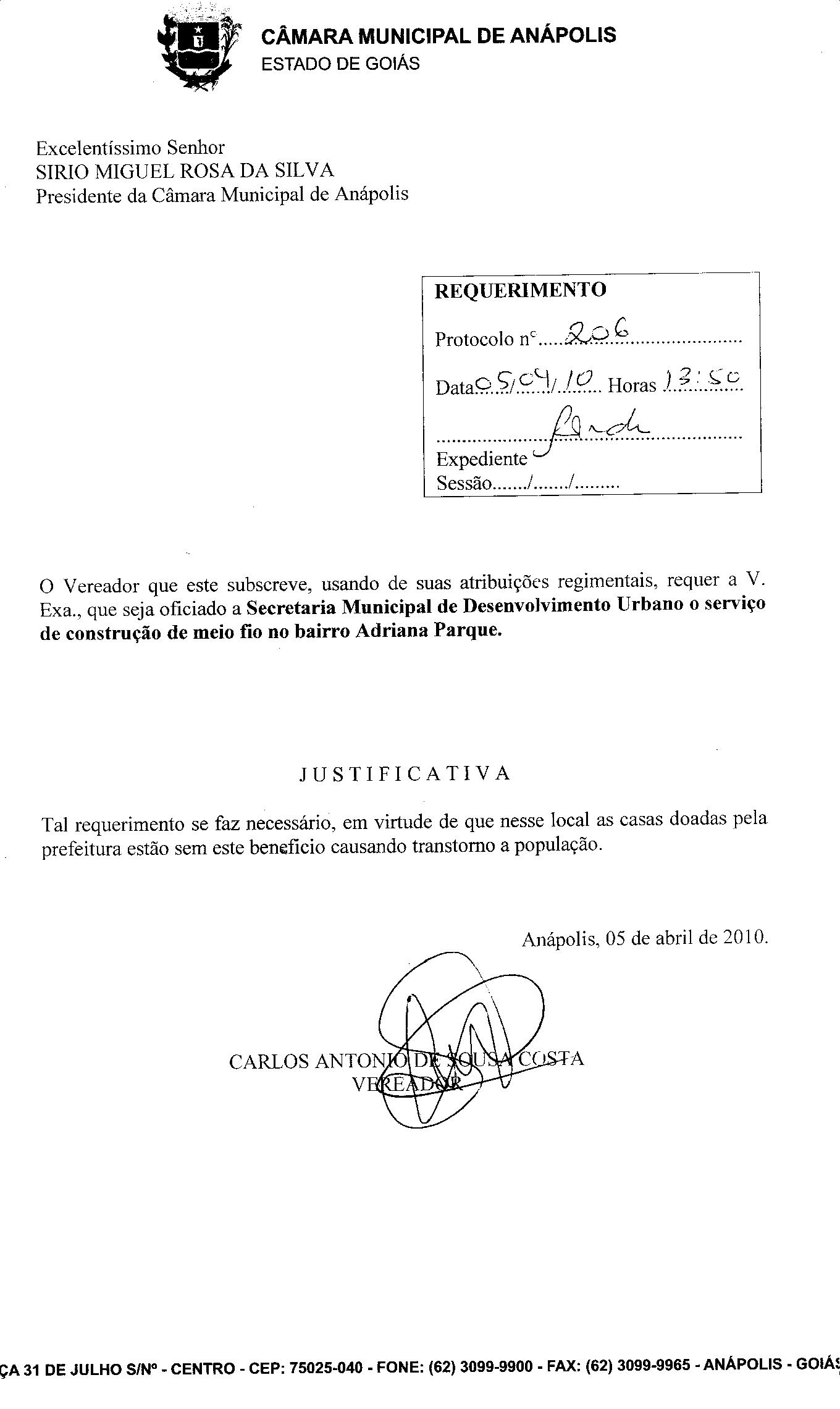 O VEREADOR QUE ESTE SUBSCREVE, USANDO DE SUAS ATRIBUIÇÕES REGIMENTAIS, REQUER A V. EXA., QUE SEJA OFÍCIADO A SECRETARIA MUNICIPAL DE DESEVOLVIMENTO URBANO O SERVIÇO DE CONSTRUÇÃO DE MEIO FIO NO BAIRRO ADRIANA PARQUE.