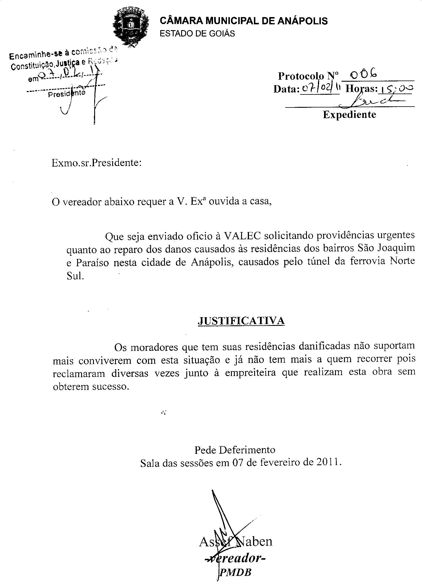 Ementa: O VEREADOR ABAIXO REQUER A V. EXª OUVIDA A CASA, QUE SEJA ENVIADO OFICIO À VALEC SOLICITANDO PROVIDÊNCIAS URGENTES QUANTO AO REPARO DOS DANOS CAUSADOS ÀS RESIDÊNCIAS DOS BAIRROS SÃO JOAQUIM E PARAÍSO NESTA CIDADE DE ANÁPOLIS, CAUSADOS PELO TÚNEL DA FERROVIA NORTE SUL.