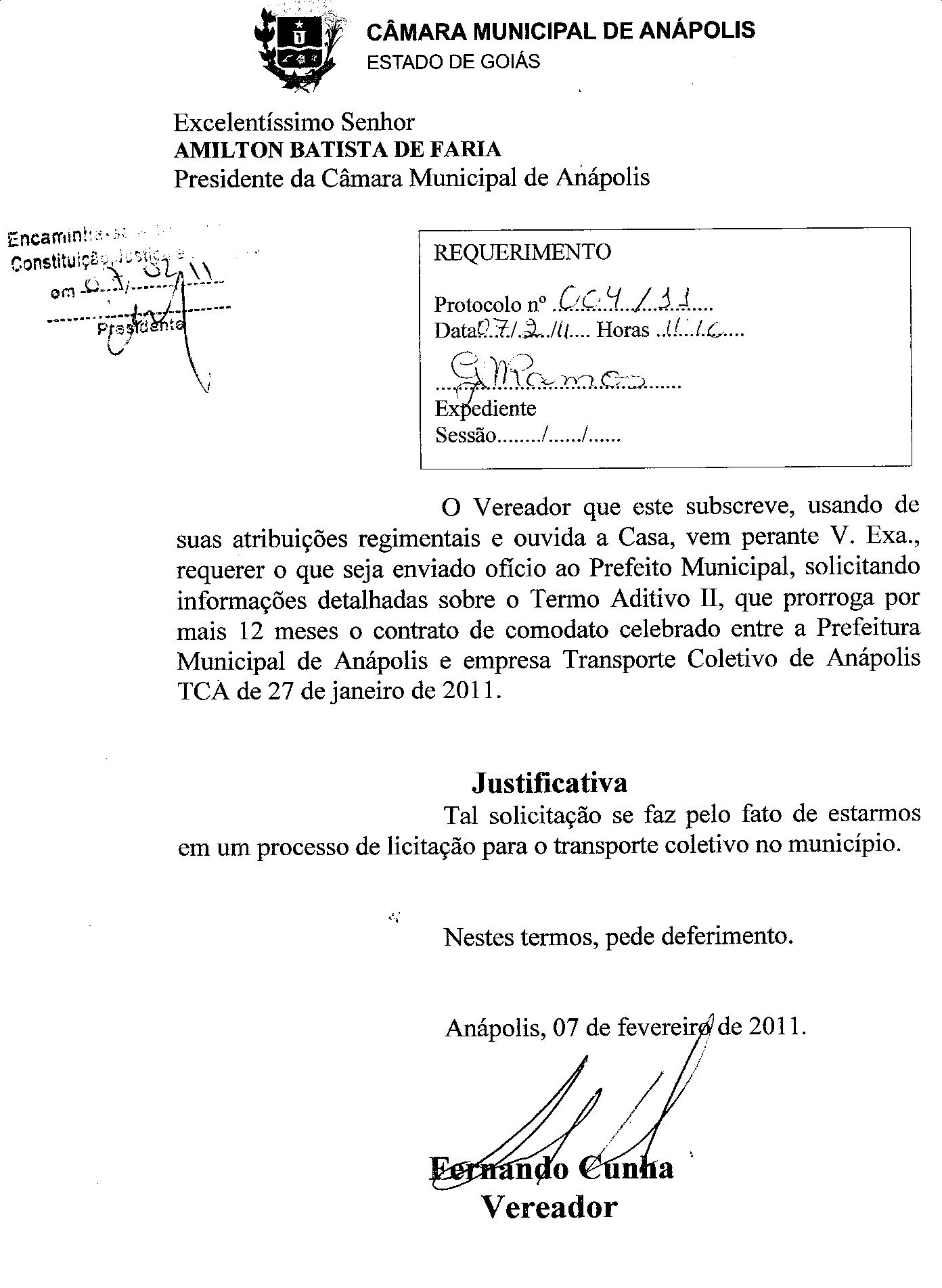 Ementa: O VEREADOR QUE ESTE SUBSCREVE, USANDO DE SUAS ATRIBUIÇÕES REGIMENTAIS E OUVIDA A CASA, VEM PERANTE V. EXA., REQUERER QUE SEJA ENVIADO OFÍCIO AO PREFEITO MUNICIPAL, SOLICITANDO INFORMAÇÕES DETALHADAS SOBRE O TERMO ADITIVO II, QUE PRORROGA POR MAIS 12 MESES O CONTRATO DE COMODATO CELEBRADO ENTRE A PREFEITURA TCA DE 27 DE JANEIRO DE 2011.
