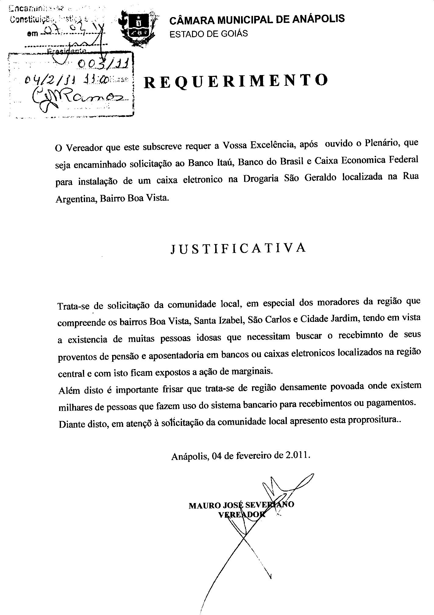 Ementa: O VEREADOR QUE ESTE SUBSCREVE REQUER A VOSSA EXCELÊNCIA, APÓS OUVIDO O PLENÁRIO, QUE SEJA ENCMINHADO SOLICITAÇÃO AO BANCO ITAÚ, BANCO DO BRASIL E CAIXA ECONOMICA FEDERAL PARA INSTALAÇÃO DE UM CAIXA ELETRONICO NA DROGARIA SÃO GERALDO LOCALIZADA NA RUA ARGENTINA, BAIRRO BOA VISTA.