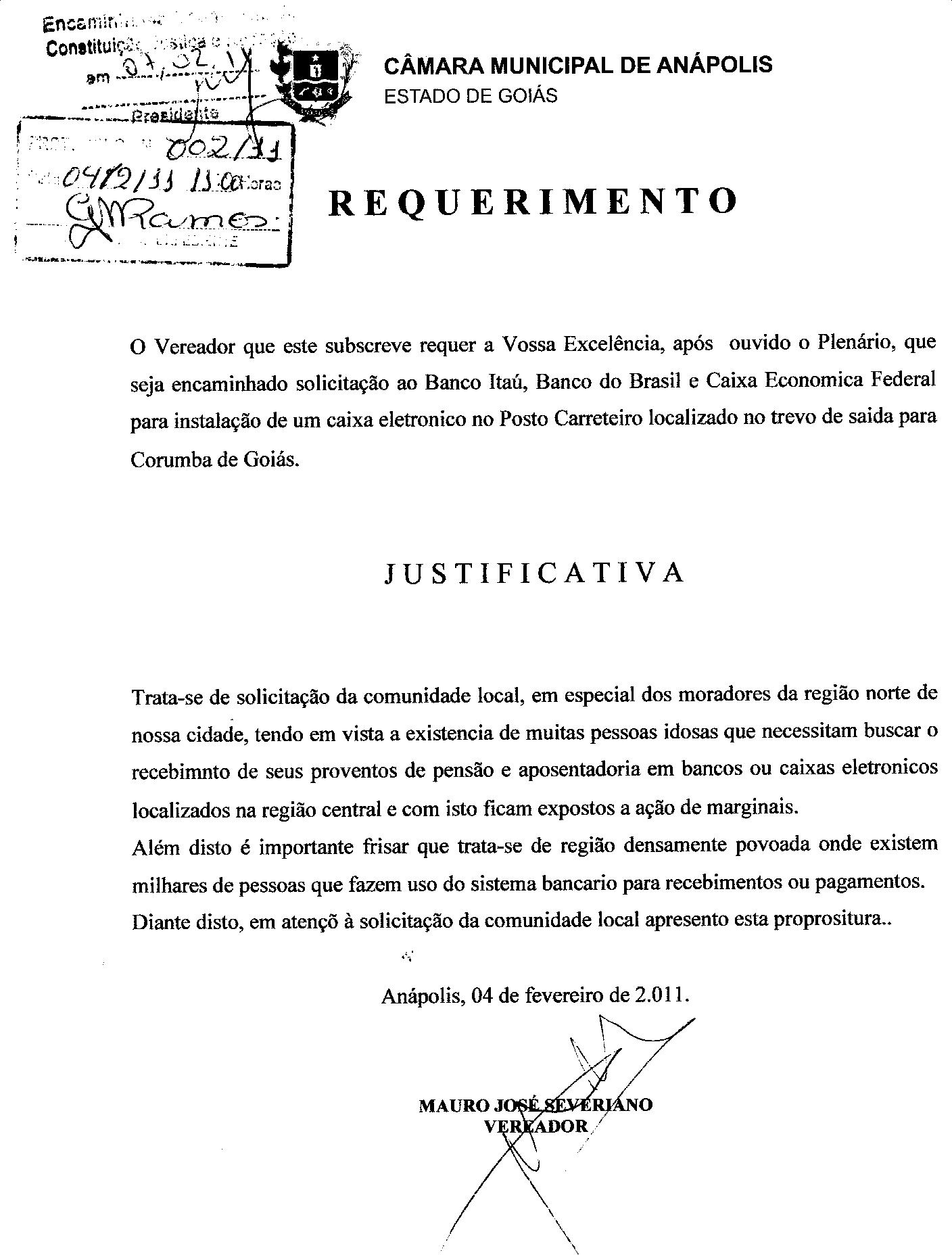 Ementa: O VEREADOR QUE ESTE SUBSCREVE REQUER A VOSSA EXCELÊNCIA, APÓS OUVIDO O PLENÁRIO, QUE SEJA ENCAMINHADO SOLICITAÇÃO AO BANCO ITAÚ, BANCO DO BRASIL E CAIXA ECONOMICA FEDERAL PARA INSTALAÇÃO DE UM CAIXA ELETRONICO NO POSTO CARRETEIRO LOCALIZADO NO TREVO DE SAIDA PARA CORUMBA DE GOIÁS.
