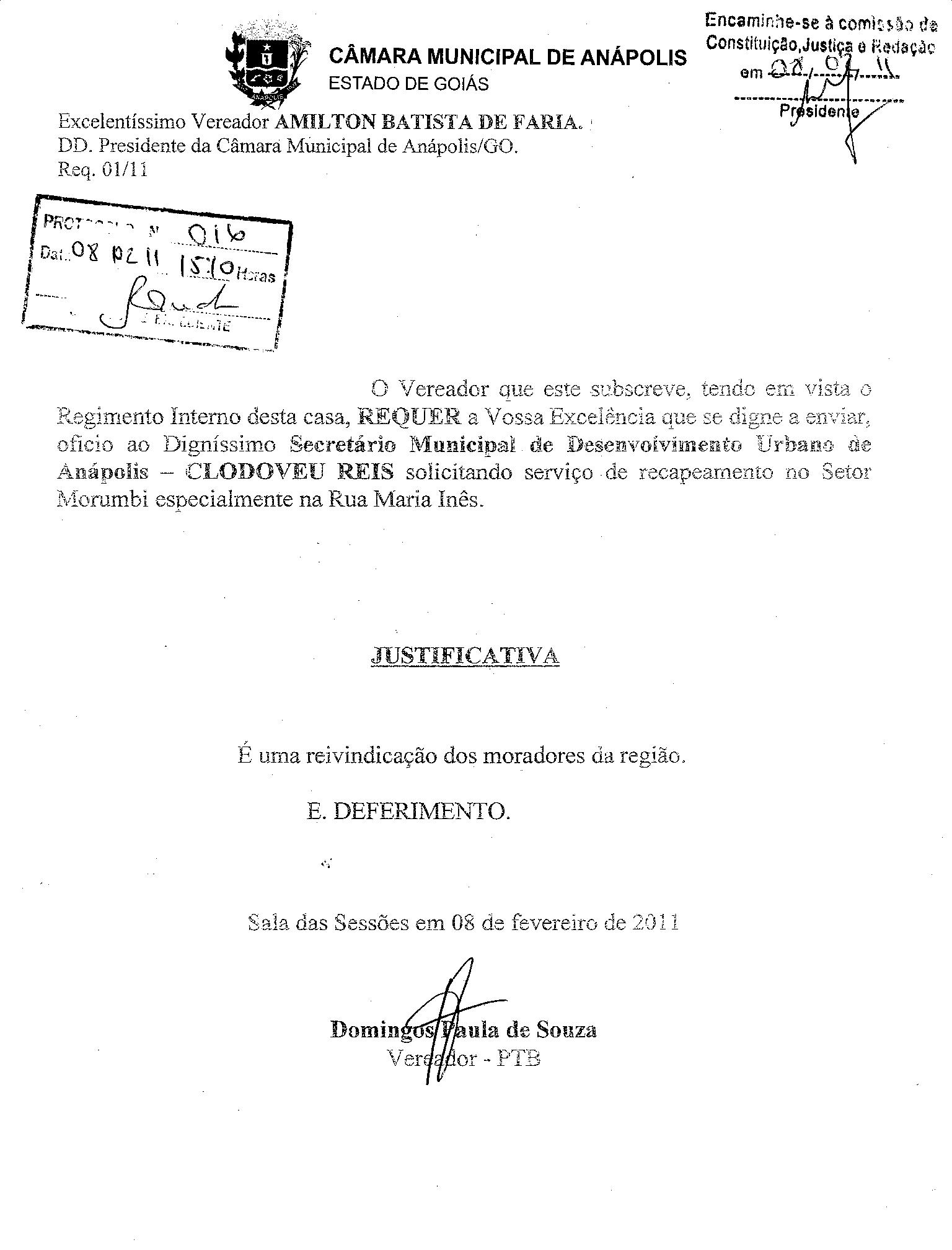 Ementa: O VEREADOR QUE ESTE SUBSCREVE, TENDO EM VISTA O REGIMENTO INTERNO DESTA CASA, REQUER A VOSSA EXCELÊNCIA QUE SE DIGNE A ENVIAR, OFÍCIO AO DIGNÍSSIMO SECRETÁRIO MUNICIPAL DE DESENVOLVIEMTO URBANO DE ANÁPOLIS - CLODOVEU REIS ,SOLICITANDO SERVIÇO DE RECAPAMENTO NO SETOR MORUMBI ESPECIALMENTE NA RUA MARIA INÊS.