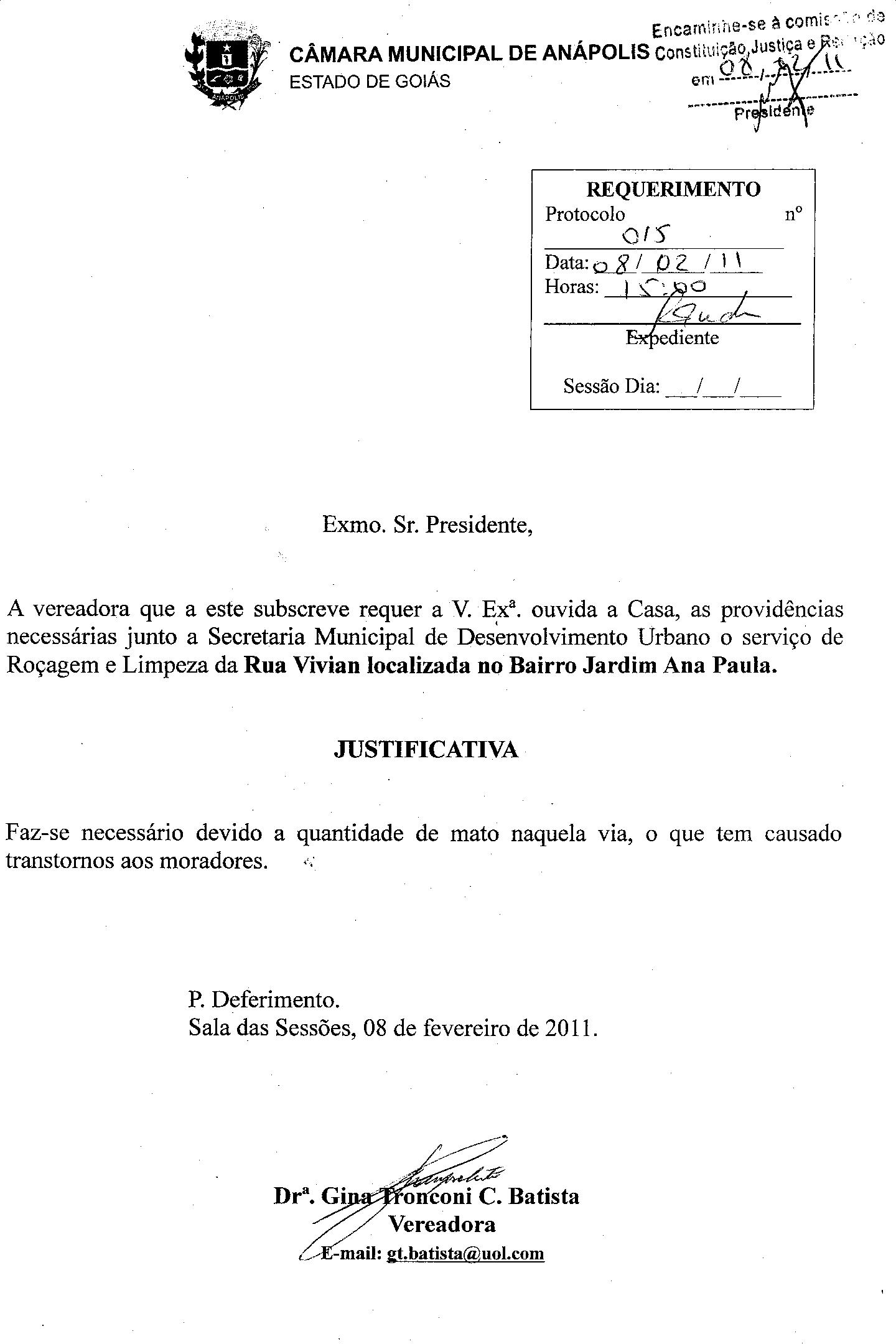Ementa: A VEREADORA QUE A ESTE SUBSCREVE REQUER A V. EXª. OUVIDA A CASA, AS PROVIDÊNCIAS NECESSÁRIAS JUNTO A SECRETARIA MUNICIPAL DE SERVIÇO DE ROÇAGEM E LIMPEZA DA RUA VIVIAN LOCALIZADA NO BAIRRO JARDIM ANA PAULA.