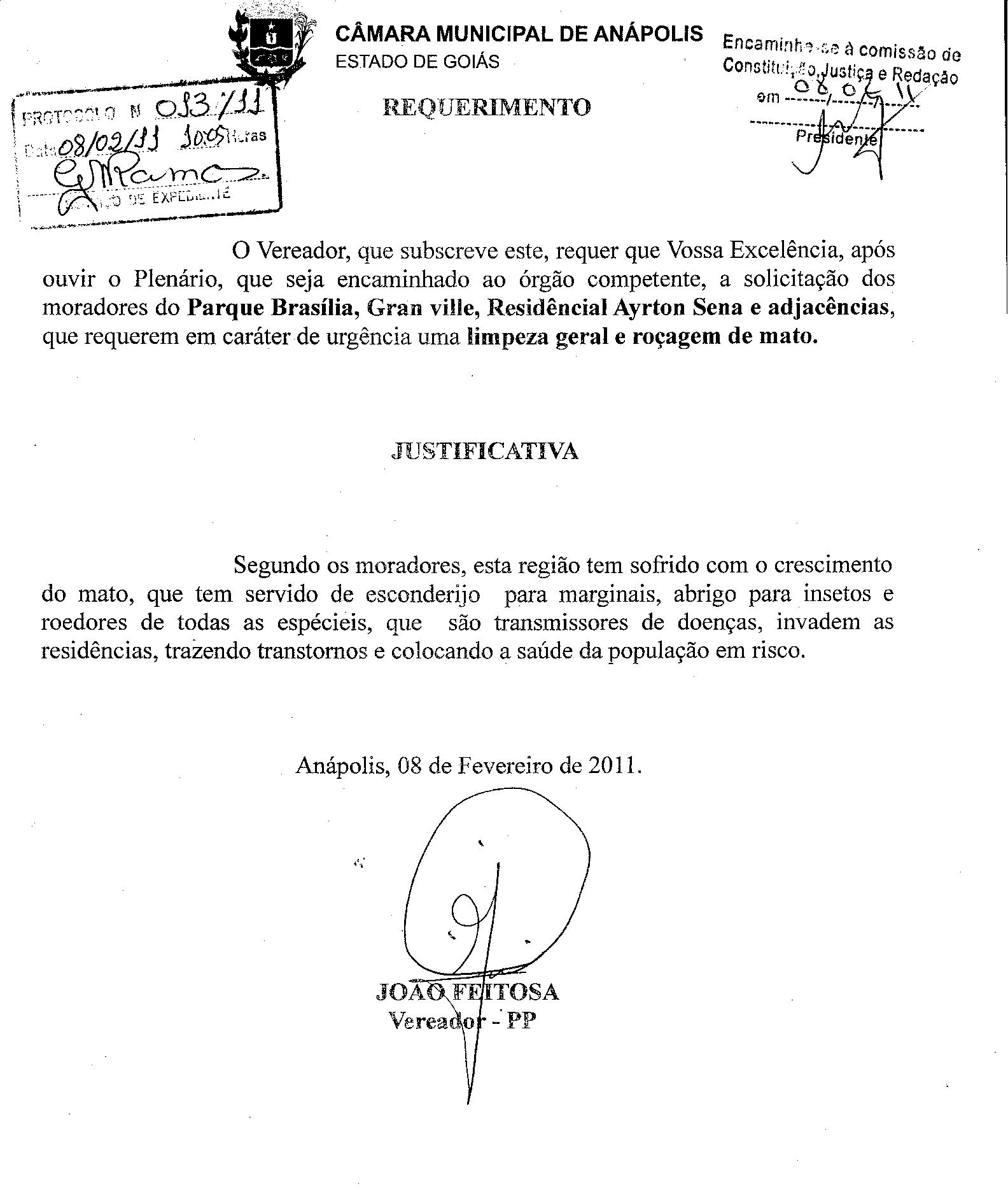 Ementa: O VEREADOR, QUE SUBSCREVE ESTE, REQUER QUE VOSSA EXCELÊNCIA, APÓS OUVIR O PLENÁRIO, QUE SEJA ENCAMINHADO AO ÓRGÃO COMPETENTE, A SOLICITAÇÃO DOS MORADORES DO PARQUE BRASÍLIA, GRAN VILLE, RESIDENCIAL AYRTON SENA E ADJACÊNCIAS, QUE REQUEREM EM CARÁTER DE URGÊNCIA UMA LIMPEZA GERAL E ROÇAGEM DE MATO.