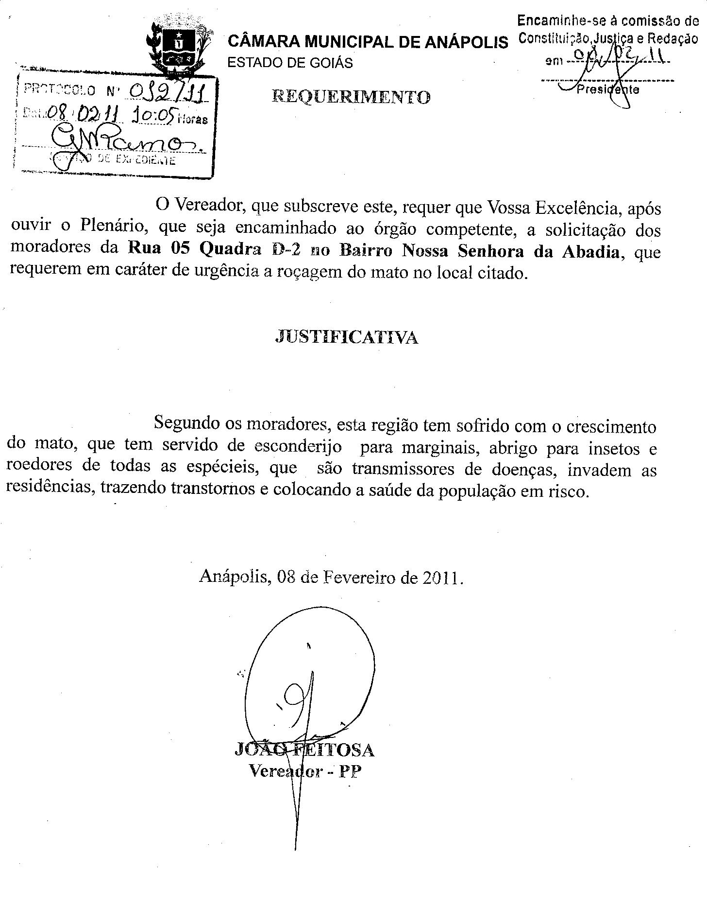 Ementa: O VEREADOR, QUE SUBSCREVE ESTE, REQUER QUE VOSSA EXCELÊNCIA, APÓS OUVIR O PLENÁRIO, QUE SEJA ENCAMINHADO AO ÓRGÃO COMPETENTE, A SOLICITAÇÃO DOS MORADORES DA RUA 05 QUADRA D-2 NO BAIRRO NOSSA SENHORA DA ABADIA, QUE REQUEREM EM CARÁTER DE URGÊNCIA A ROÇAGEM DO MATO NO LOCAL CITADO.