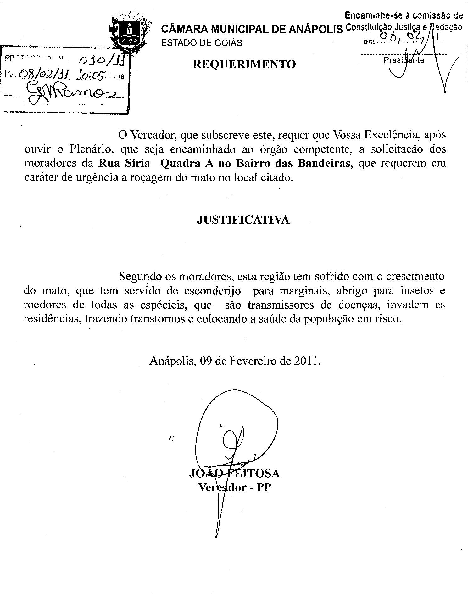 Ementa: O VEREADOR, QUE SUBSCREVE ESTE, REQUER QUE VOSSA EXCELÊNCIA, APÓS OUVIR O PLENÁRIO, QUE SEJA ENCAMINHADO AO ÓRGÃO COMPETENTE, A SOLICITAÇÃO DOS MORADORES DA RUA SÍRIA QUADRA A NO BAIRRO DAS BANDEIRAS, QUE REQUEREM EM CARÁTER DE URGÊNCIA A ROÇAGEM DO MATO NO LOCAL CITADO.