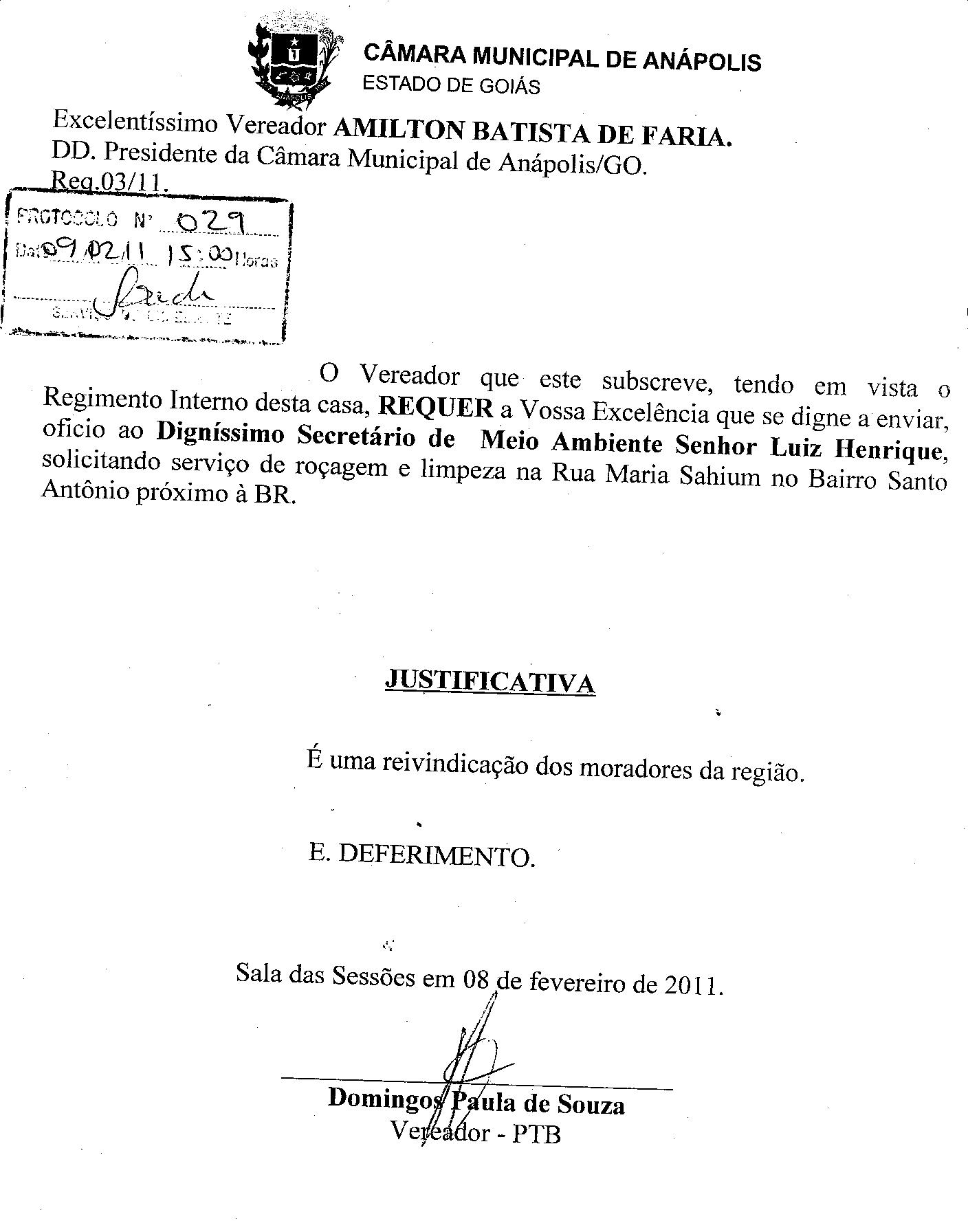 Ementa: O VEREADOR QUE ESTE SUBSCREVE, TENDO EM VISTA O REGIMENTO INTERNO DESTA CASA, REQUER A VOSSA EXCELÊNCIA QUE SE DIGNE A ENVIAR, OFÍCIO AO DIGNÍSSIMO SECRETÁRIO DE MEIO AMBIENTE SENHOR LUIZ HENRIQUE, SOLICITANDO SERVIÇO DE ROÇAGEM E LIMPEZA NA RUA MARIA SAHIUM NO BAIRRO SANTO ANTÔNIO PRÓXIMO À BR.