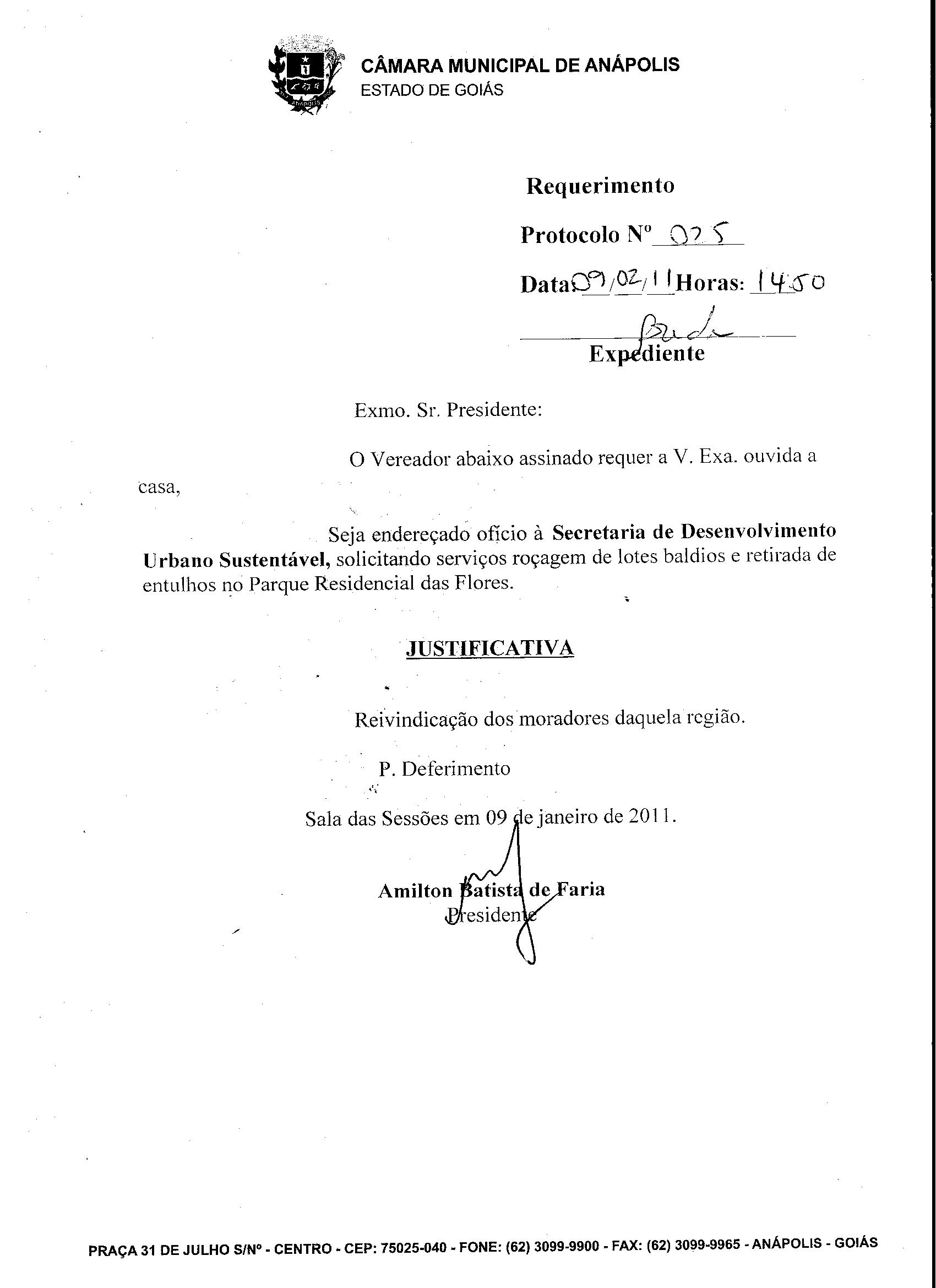 Ementa: O VEREADOR ABAIXO ASSINADO REQUER A V.EXA. OUVIDA A CASA, SEJA ENDEREÇAO OFÍCIO À SECRETÁRIA DE DESENVOLVIMENTO URBANO SUSTENTÁVEL, SOLICITANDO SERVIÇOS ROÇAGEM DE LOTES BALDIOS E RETIRADA DE ENTULHOS NO PARQUE RESIDENCIAL DAS FLORES.