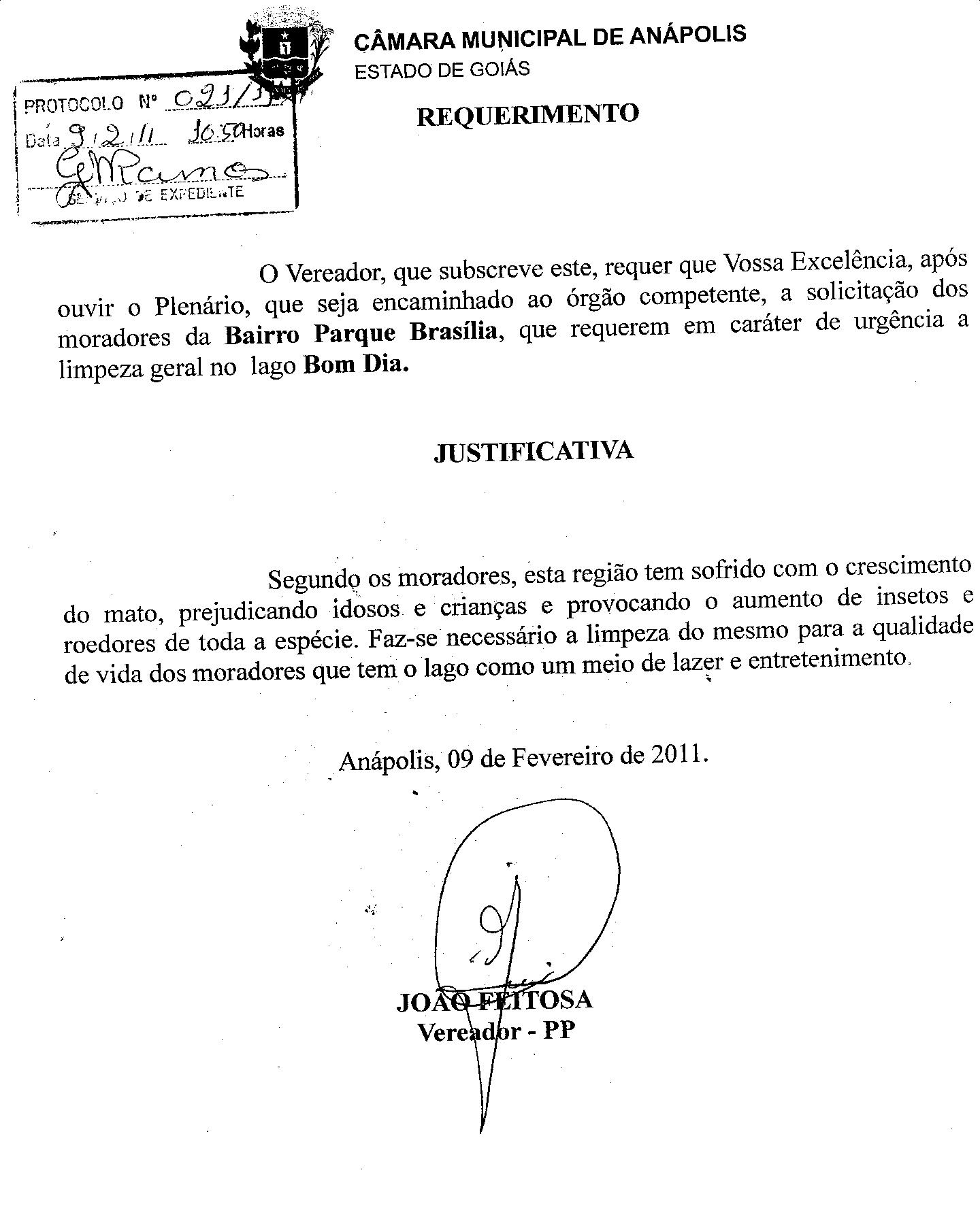 Ementa: O VEREADOR, QUE SUBSCREVE ESTE, REQUER QUE VOSSA EXCELÊNCIA, APÓS OUVIR O PLENÁRIO, QUE SEJA ENCAMINHADO AO ÓRGÃO COMPETENTE, A SOLICITAÇÃO DOS MORADORES DO BAIRRO PARQUE BRASÍLIA, QUE REQUEREM EM CARÁTER DE URGÊNCIA A LIMPEZA GERAL NO LAGO BOM DIA.