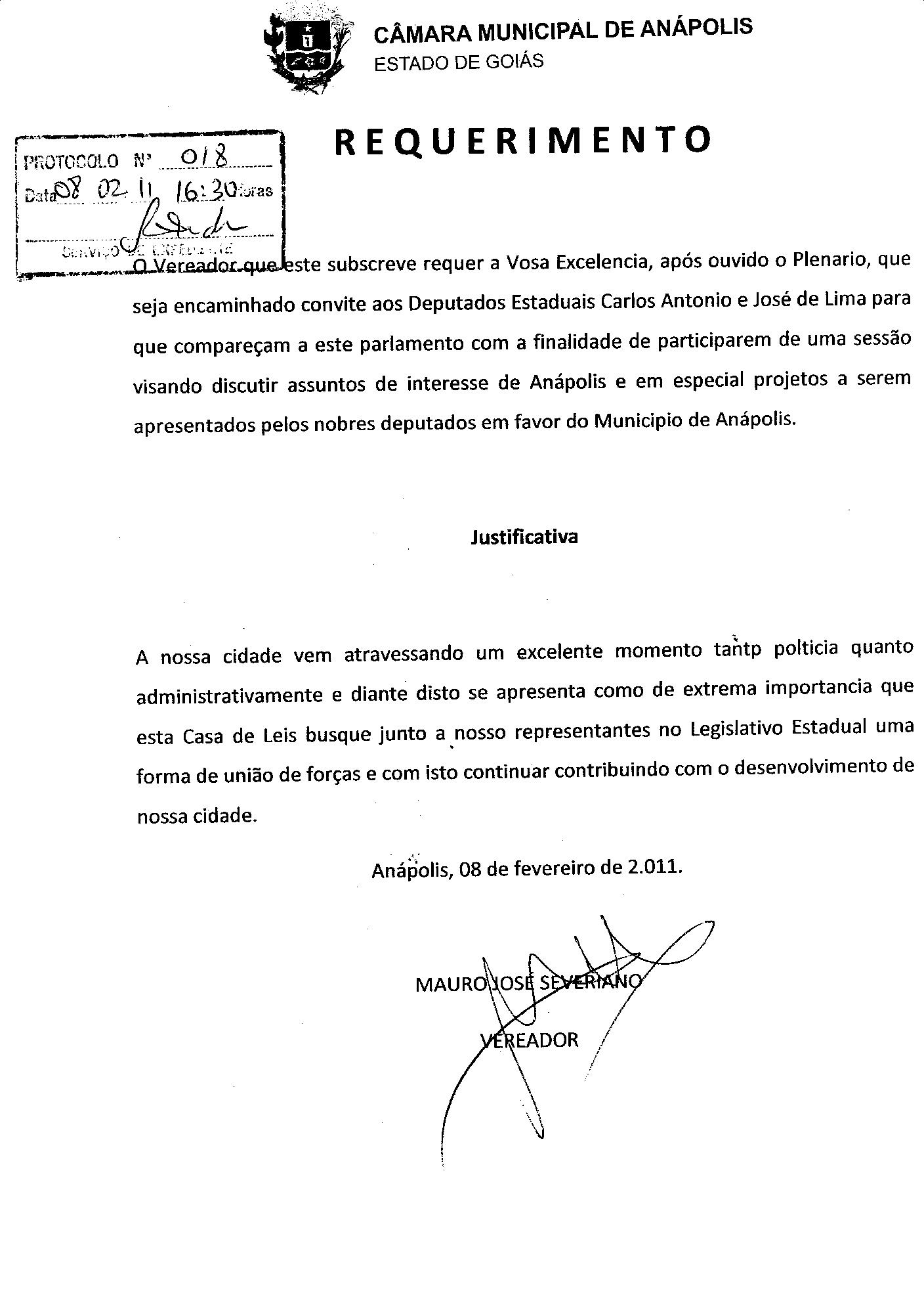 Ementa: O VEREADOR QUE ESTE SUBSCREVE REQUER A VOSSA EXCELÊNCIA, APÓS OUVIDO O PLENÁRIO, QUE SEJA ENCAMINHADO CONVITE AOS DEPUTADOS ESTADUAIS CARLOS ANTONIO E JOSÉ DE LIMA PARA QUE COMPAREÇAM A ESTE PARLAMENTO COM A FINALIDADE DE PARTICIPAREM DE UMA SESSÃO VISANDO DISCUTIR ASSUNTOS DE INTERESSE EM FAVOR DO MUNICÍPIO DE ANÁPOLIS E EM ESPECIAL PROJETOS A SEREM APRESENTADOS PELOS NOBRES DEPUTADOS EM FAVOR DO MUNICÍPIO DE ANÁPOLIS.