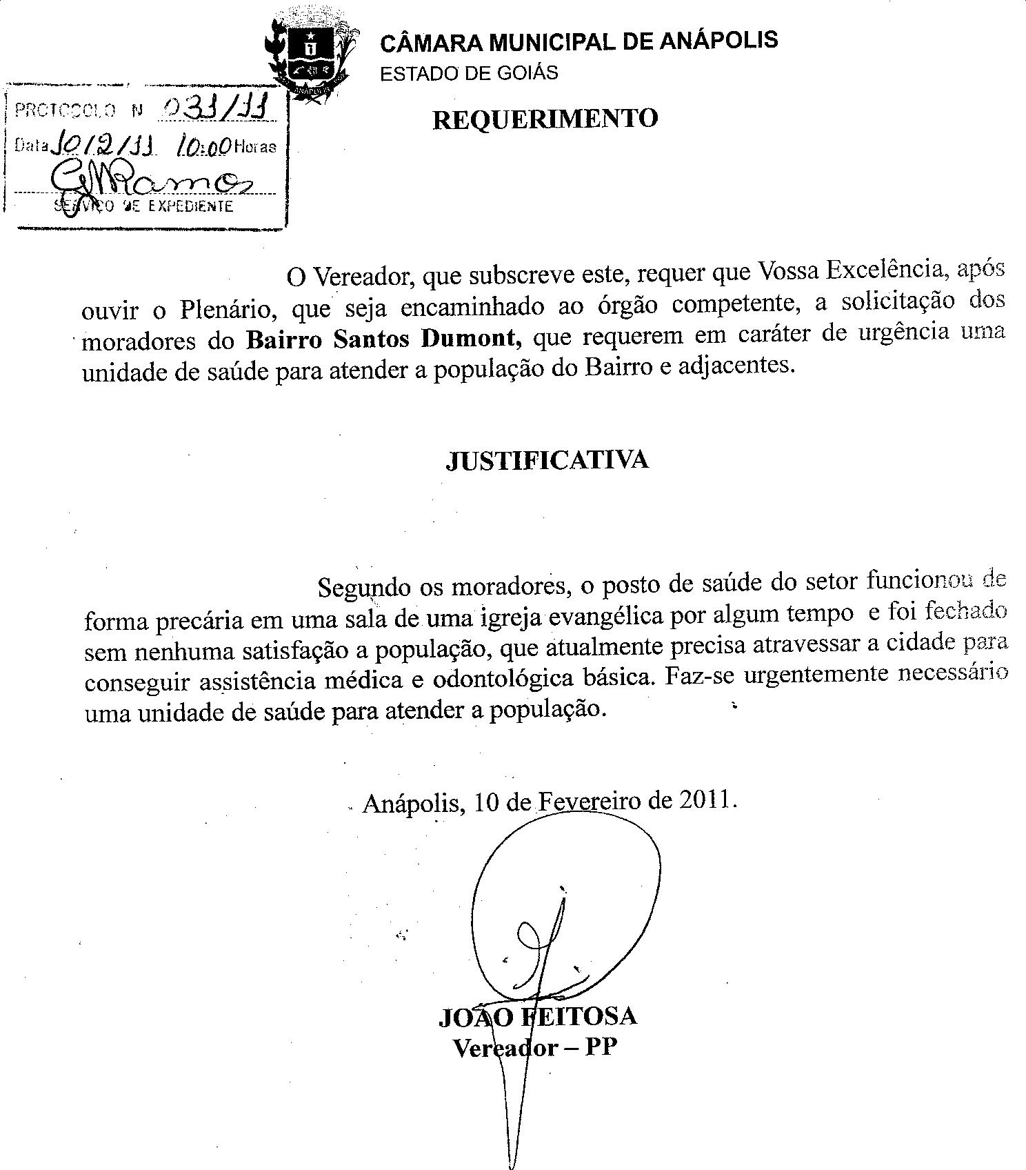 Ementa: O VEREADOR, QUE SUBSCREVE ESTE, REQUER QUE VOSSA EXCELÊNCIA, APÓS OUVIR O PLENÁRIO, QUE SEJA ENCAMINHADO AO ÓRGÃO COMPETENTE, A SOLICITAÇÃO DOS MORADORES DO BAIRRO SANTOS DUMONT, QUE REQUEREM EM CARÁTER DE URGÊNCIA UMA UNIDADE DE SAÚDE PARA ATENDER A POPULAÇÃO DO BAIRRO E ADJACENTES.