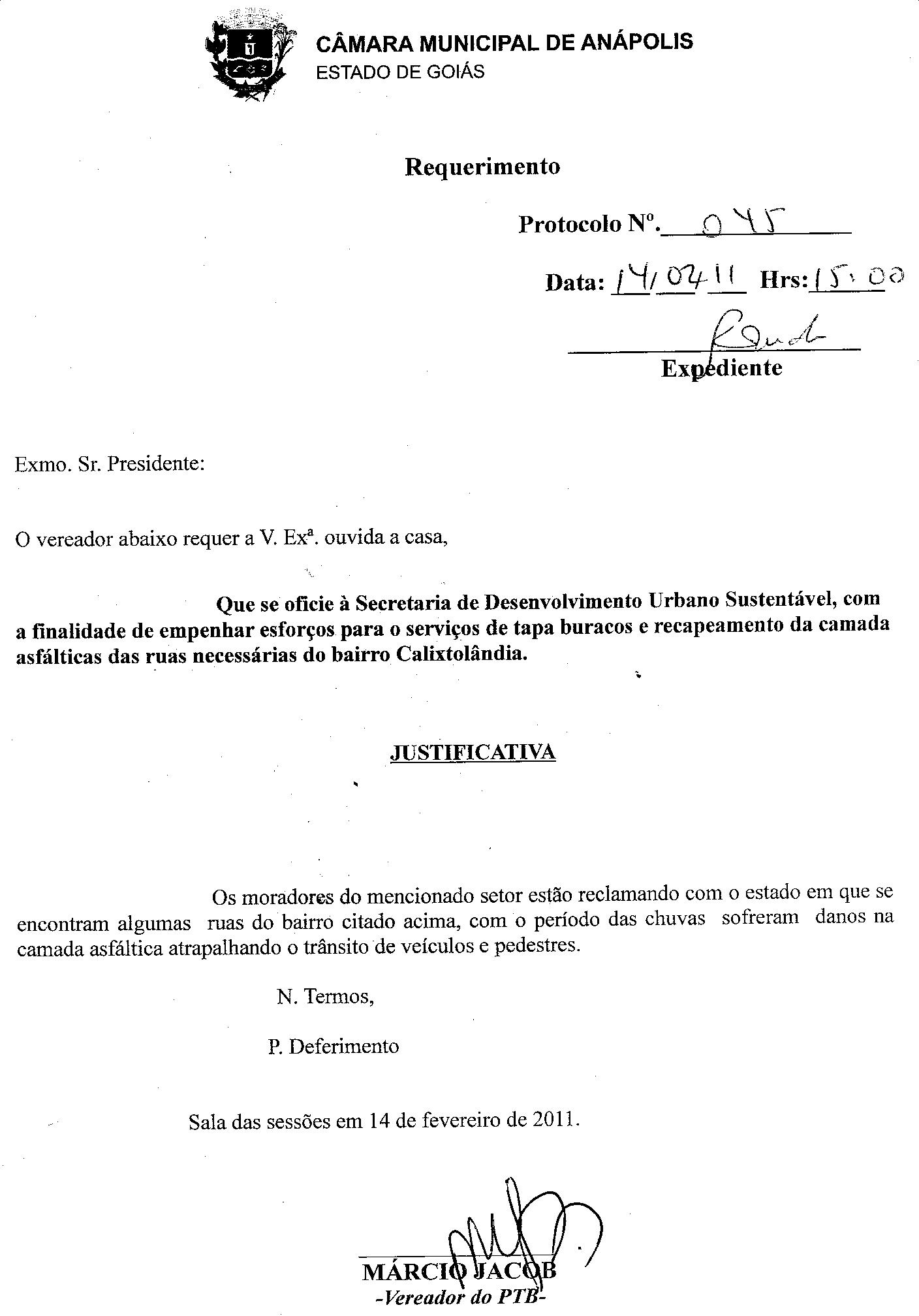 Ementa: O VEREADOR ABAIXO REQUER A V.EXª. OUVIDA A CASA, QUE SE OFÍCIE À SECRETARIA DE DESENVOLVIMENTO URBANO SUSTENTÁVEL, COM A FINALIDADE DE EMPENHAR ESFORÇOS PARA O SERVIÇOS DE TAPA BURACOS E RECAPEAMENTO DE CAMADA ASFÁTICAS DAS RUAS NECESSÁRIAS DO BAIRRO CALIXTOLÂNDIA.