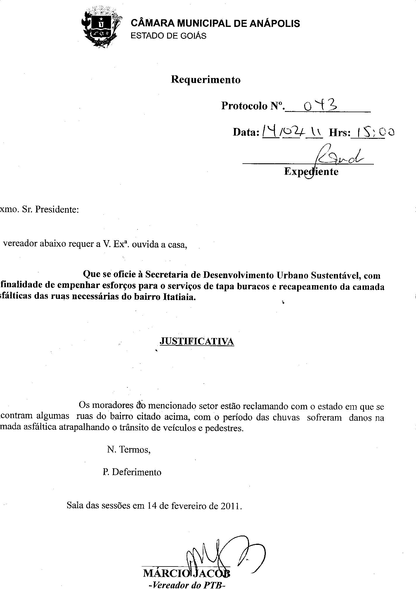 Ementa: O VEREADOR ABAIXO REQUER A V. EXª. OUVIDA A CASA, QUE SE OFÍCIE À SECRETARIA DE DESENVOLVIMENTO URBANO SUSTENTÁVEL , COM A FINALIDADE DE EMPENHAR ESFORÇOS PARA O SERVIÇOS DE TAPA BURACOS E RECAPEAMENTO DA CAMADA ASFÁLTICAS DAS RUAS NECESSÁRIAS DO BAIRRO ITATIAIA.