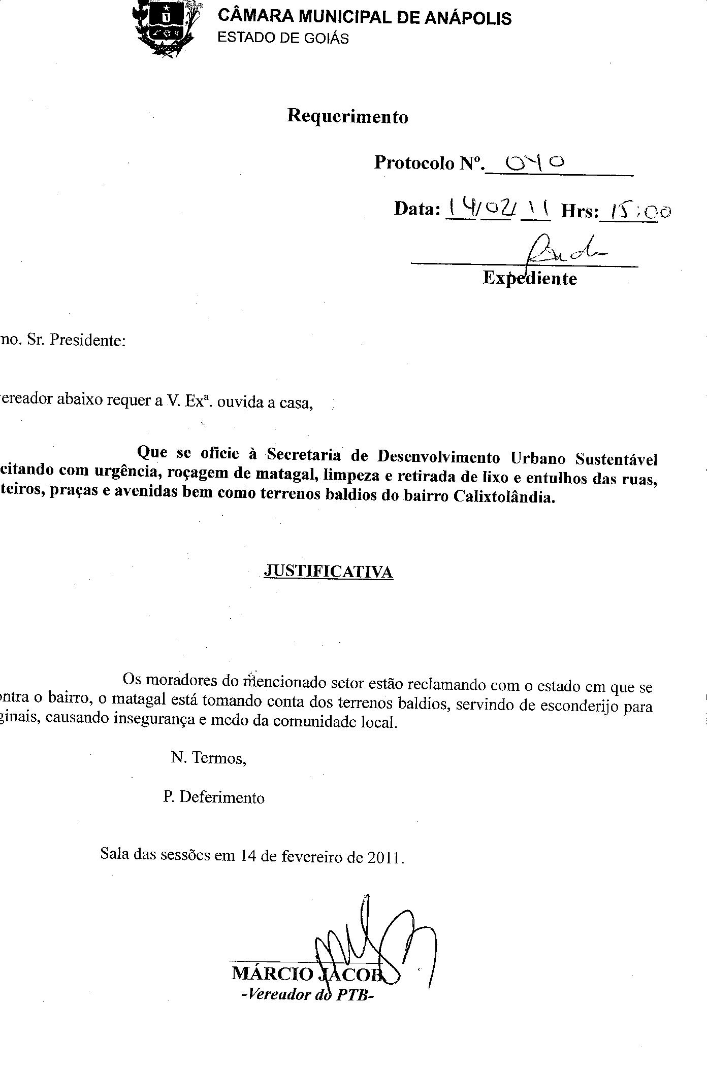 Ementa: O VEREADOR ABAIXO REQUER A V. EXª. OUVIDA A CASA, QUE SE OFÍCIE À SECRETARIA DE DESENVOLVIMENTO URBANO SUSTENTÁVEL SOLICITANDO COM URGÊNCIA, ROÇAGEM DE MATAGAL, LIMPEZA E RETIRADA DE LIXO E ENTULHOS DAS RUAS, CANTEIROS, PRAÇAS E AVENIDAS BEM COMO TERRENOS BALDIOS DO BAIRRO CALIXTÔLANDIA.