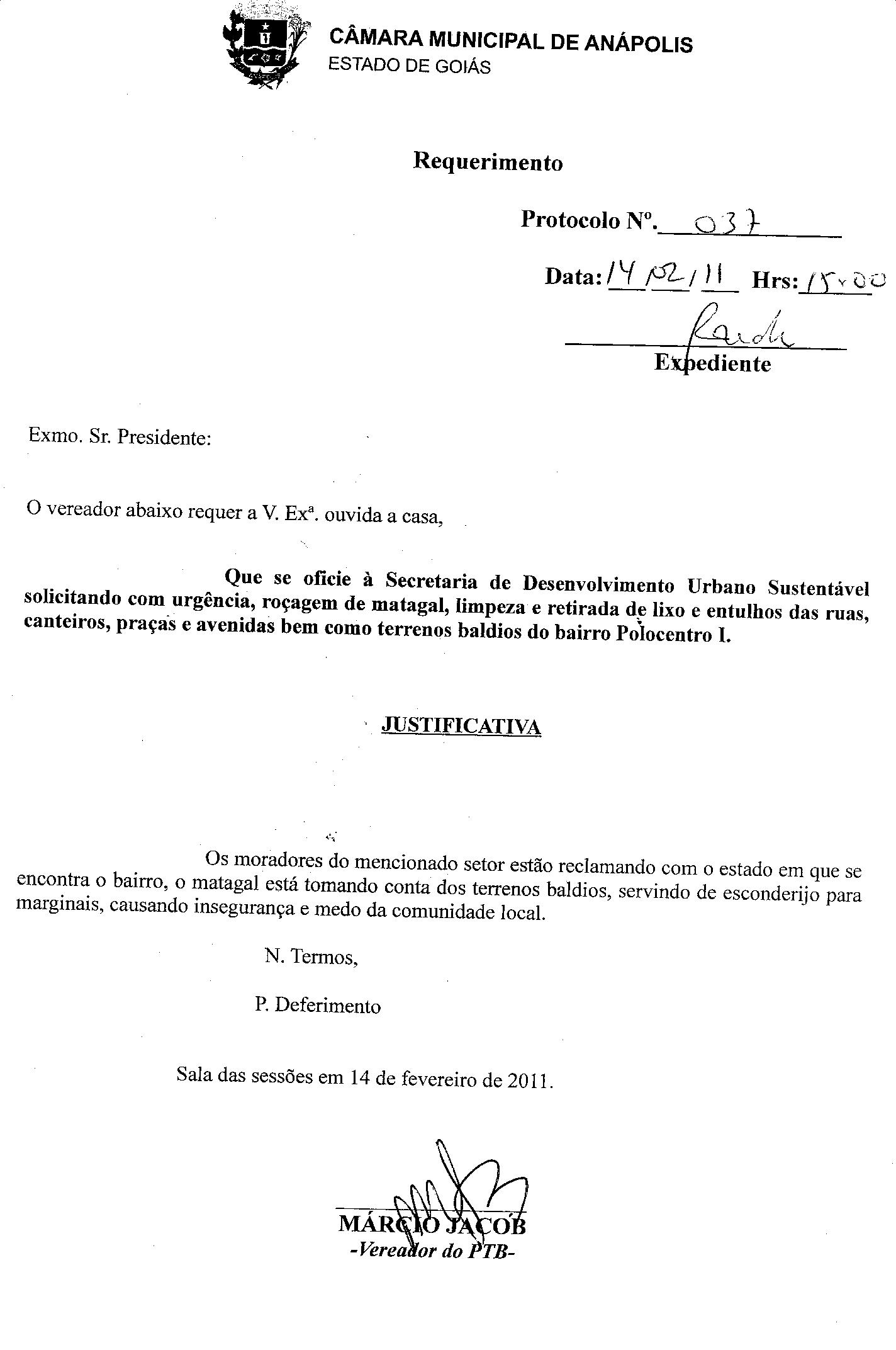 Ementa: O VEREADOR ABAIXO REQUER A V. EXª . OUVIDA A CASA, QUE SE OFÍCIE À SECRETARIA DE DESENVOLVIMENTO URBANO SUSTENTÁVEL SOLICITANDO COM URGÊNCIA, ROÇAGEM DE MATAGAL, LIMPEZA E RETIRADA DE LIXO E ENTULHOS DAS RUAS, CANTEIROS, PRAÇAS E AVENIDAS BEM COMO TERRENOS BALDIOS DO BAIRRO POLOCENTRO II.