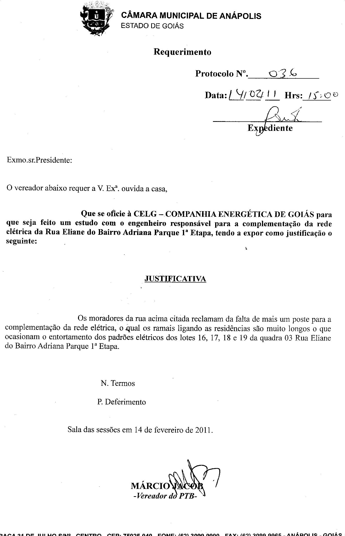 Ementa: O VEREADOR ABAIXO REQUER A V.EXª. OUVIDA A CASA, QUE SE OFÍCIE À CELG - COMPANHIA ENERGÉTICA DE GOIÁS PARA QUE SEJA FEITO UM ESTUDO COM O ENGENHEIRO RESPONSÁVEL PARA A COMPLEMENTAÇÃO DA REDE ELÉTRICA DA RUA ELIANE DO BAIRRO ADRIANA PARQUE 1ª ETAPA, TENDO A EXPOR COMO JUSTIFICAÇÃO O SEGUINTE: