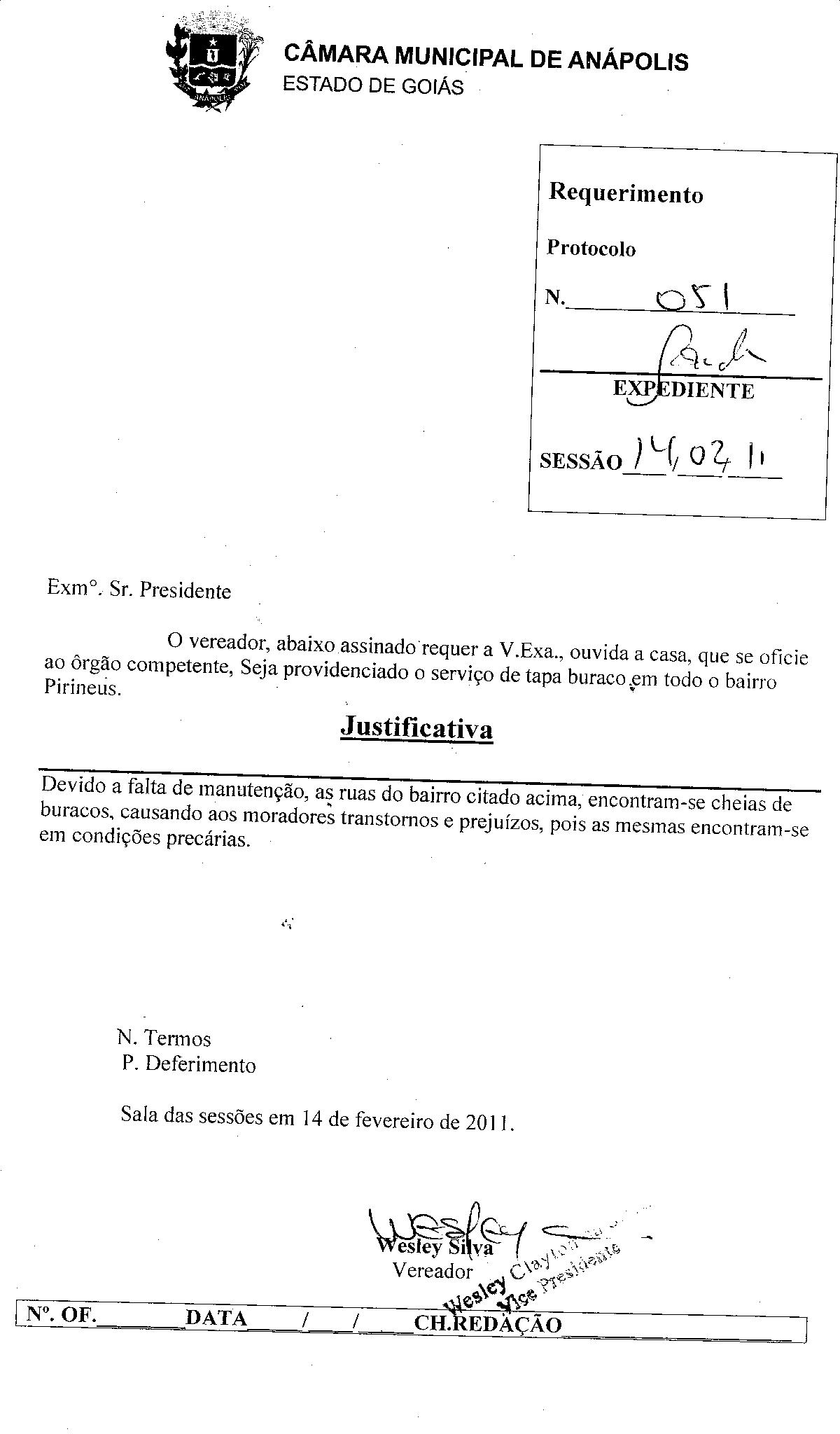 Ementa: O VEREADOR, ABAIXO ASSINADO REQUER A V.EXA., OUVIDA A CASA, QUE SE OFÍCIE AO ÓRGÃO COMPETENTE, SEJA PROVIDENCIADO O SERVIÇO DE TAPA BURACO EM TODO O BAIRRO PIRINEUS.