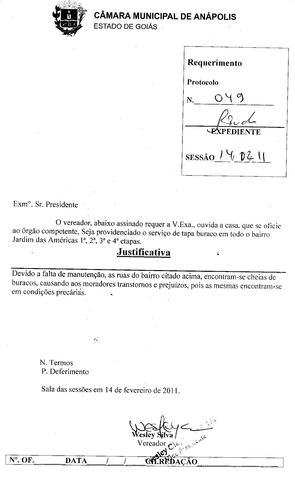 Ementa: O VEREADOR, ABAIXO ASSINADO REQUER A V.EXA., OUVIDA A CASA,QUE SE OFÍCIE AO ÓRGÃO COMPETENTE, SEJA PROVIDENCIADO O SERVIÇO DE TAPA BURACO EM TODO BAIRRO JARDIM DAS AMÉRICAS 1ª.2ª,3ª E 4ª ETAPAS.
