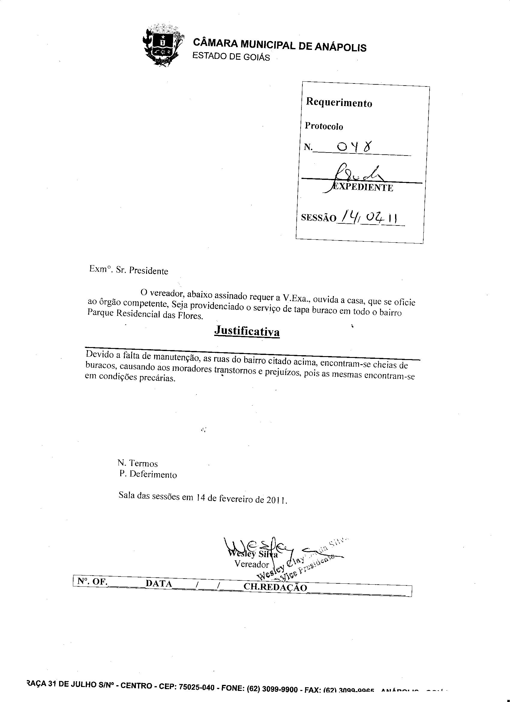 Ementa: O VEREADOR, ABAIXO ASSINADO REQUER A V.EXA., OUVIDA A CASA, QUE SE OFÍCIE AO ÓRGÃO COMPETENTE, SEJA PROVIDENCIADO O SERVIÇO DE TAPA BURACO EM TODO O BAIRRO PARQUE RESIDENCIAL DAS FLORES.