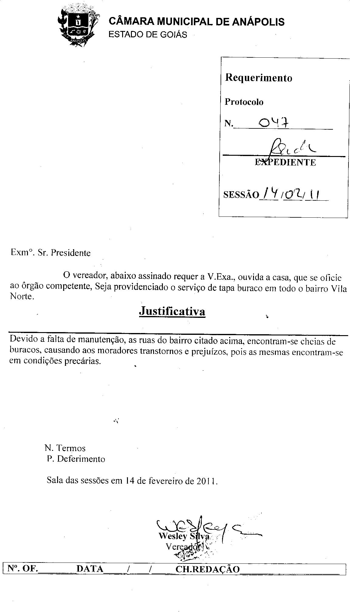 Ementa: O VEREADOR, ABAIXO ASSINADO REQUER A V.EXA., OUVIDA A CASA, QUE SE OFÍCIE AO ÓRGÃO COMPETENTE, SEJA PROVIDENCIADO O SERVIÇO DE TAPA BURACO EM TODO O BAIRRO VILA NORTE.