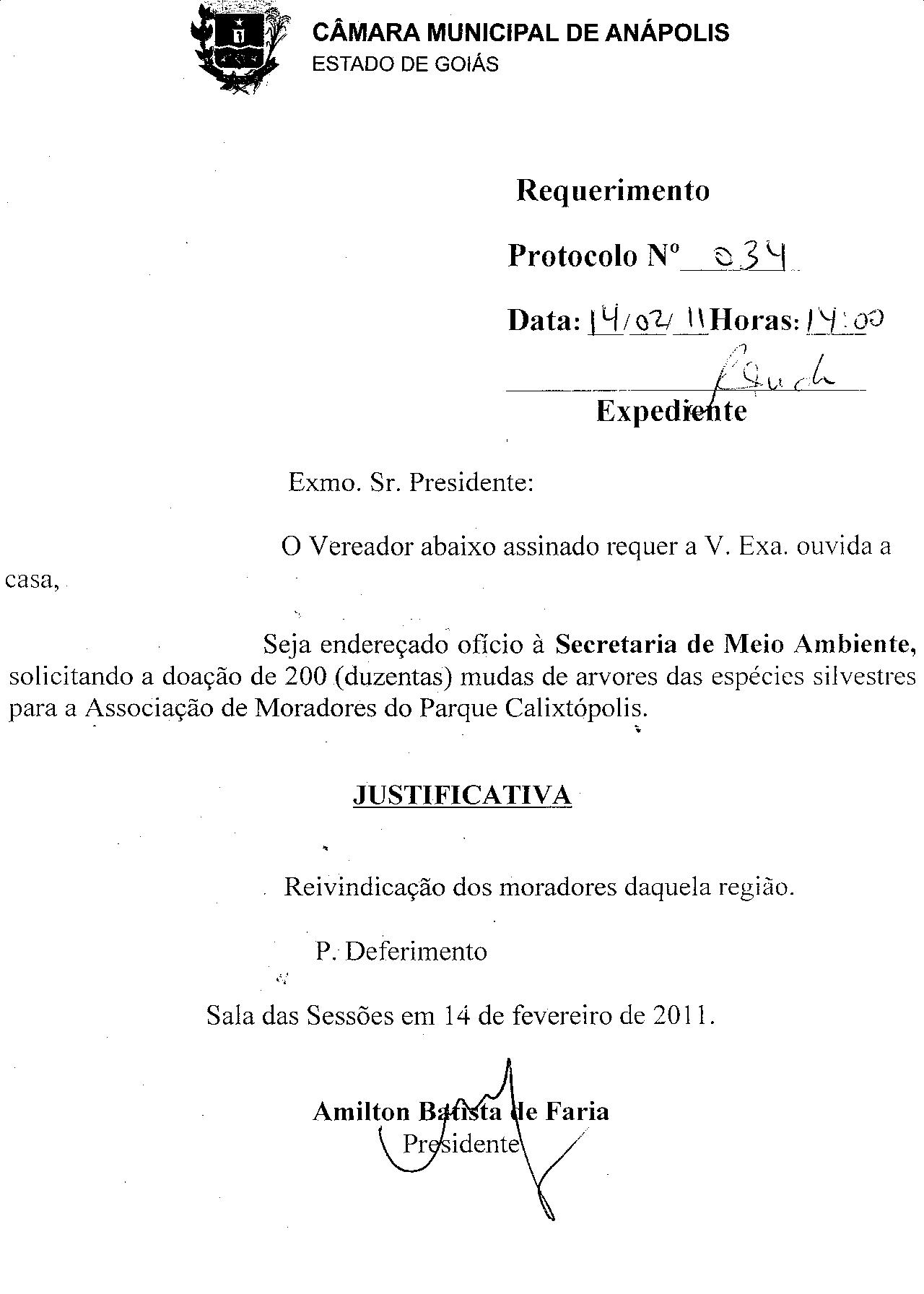 Ementa: O VEREADOR ABAIXO ASSINADO REQUER A V. EXA. OUVIDA A CASA, SEJA ENDEREÇADO OFÍCIO À SECRETARIA DE MEIO AMBIENTE, SOLICITANDO A DOAÇÃO DE 200(DUZENTAS) MUDAS DE ARVORES DAS ESPÉCIES SILVESTRES PARA A ASSOCIAÇÃO DE MORADORES DO PARQUE CALIXTÒPOLIS.