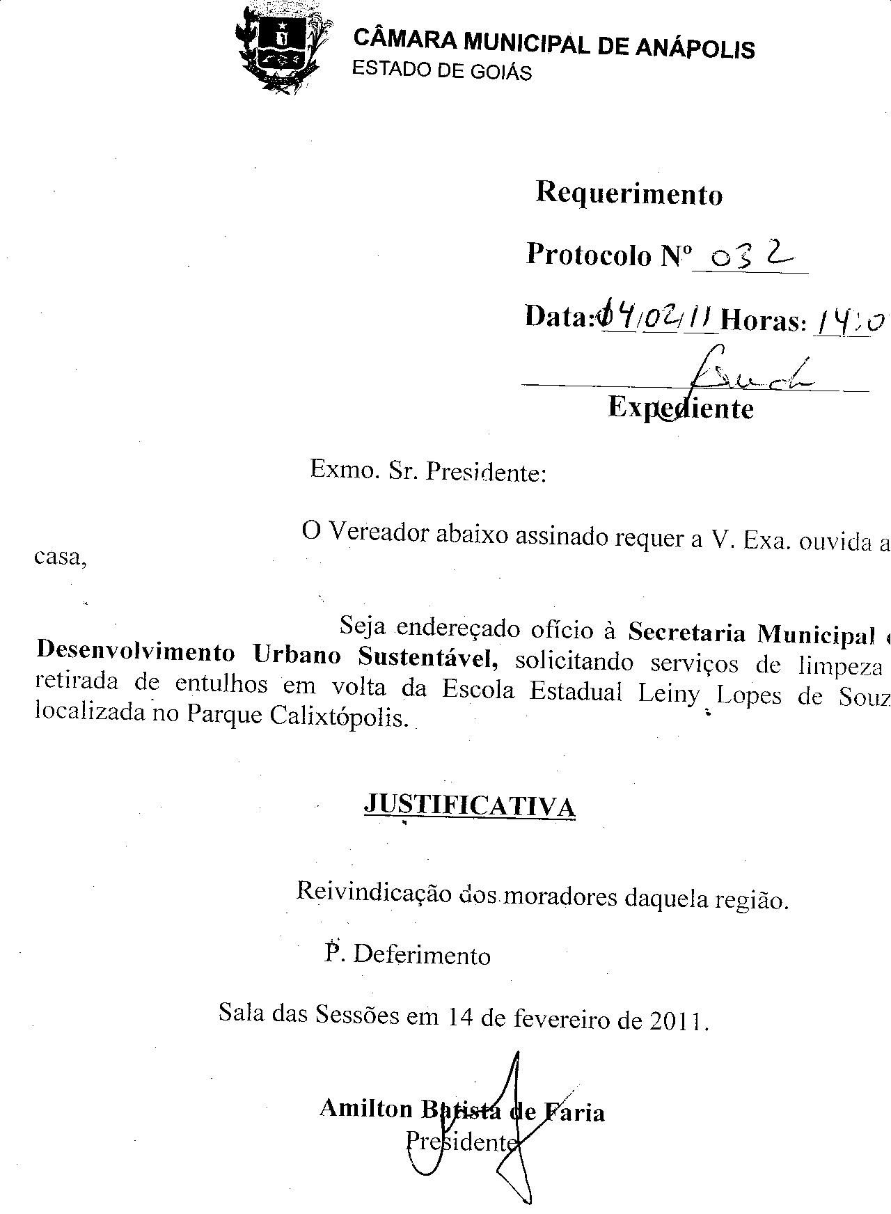 Ementa: O VEREADOR ABAIXO ASSINADO REQUER A V.EXA. OUVIDA A CASA, SEJA ENDEREÇADO OFÍCIO À SECRETÁRIA MUNICIPAL DE DESENVOLVIMENTO URBANO SUSTENTÁVEL, SOLICITANDO SERVIÇO DE LIMPEZA E RETIRADA DE ENTULHOS EM VOLTA DA ESCOLA ESTADUAL LEINY LOPES DE SOUZA, LOCALIZADA NO PARQUE CALIXTÓPOLIS.
