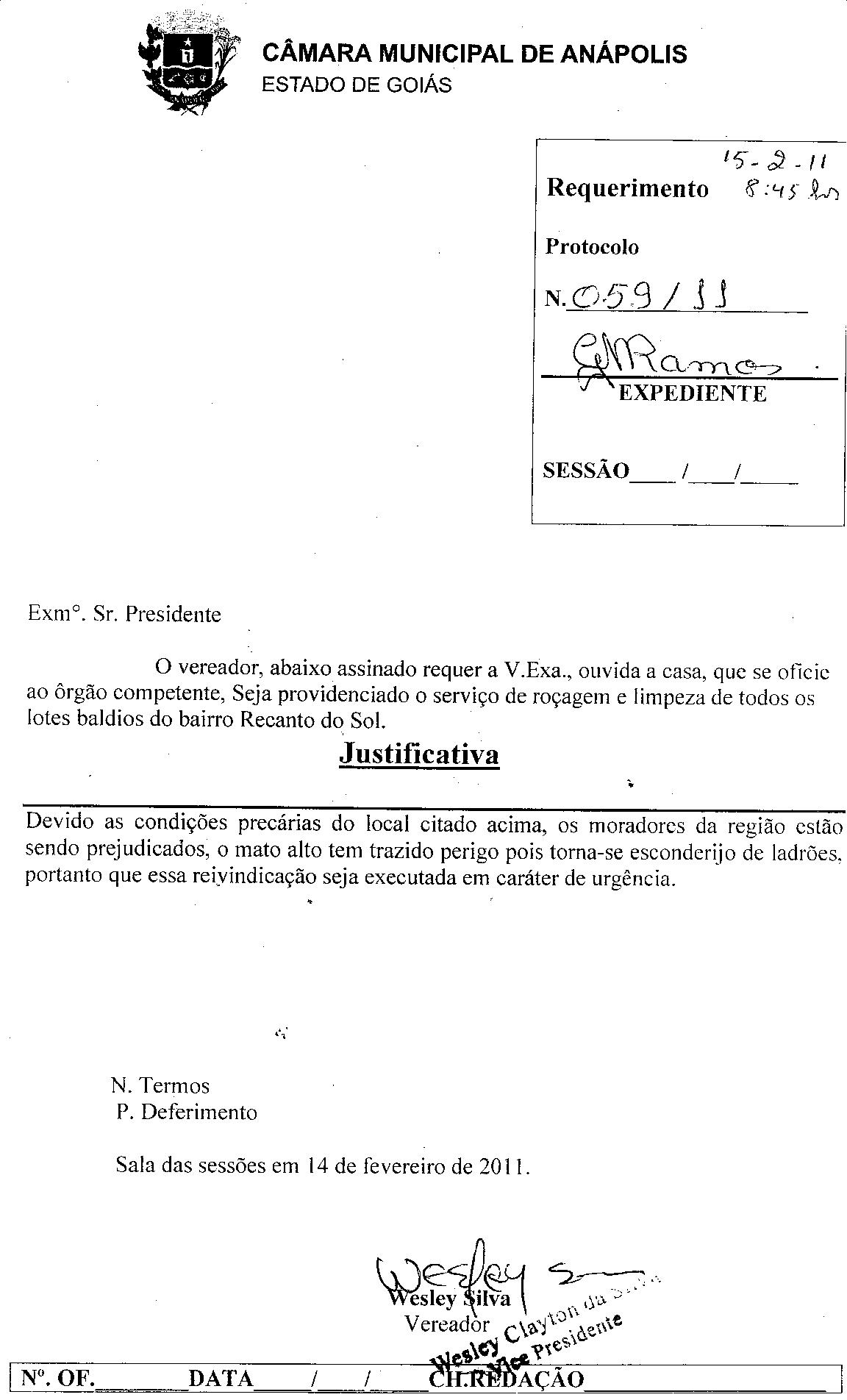 Ementa: O VEREADOR, ABAIXO ASSINADO REQUER A V.EXA., OUVIDA A CASA, QUE SE OFÍCIE AO ÓRGÃO COMPETENTE, SEJA PROVIDÊNCIADO O SERVIÇO DE ROÇAGEM E LIMPEZA DE TODOS OS LOTES BALDIOS DO BAIRRO RECANTO DO SOL.