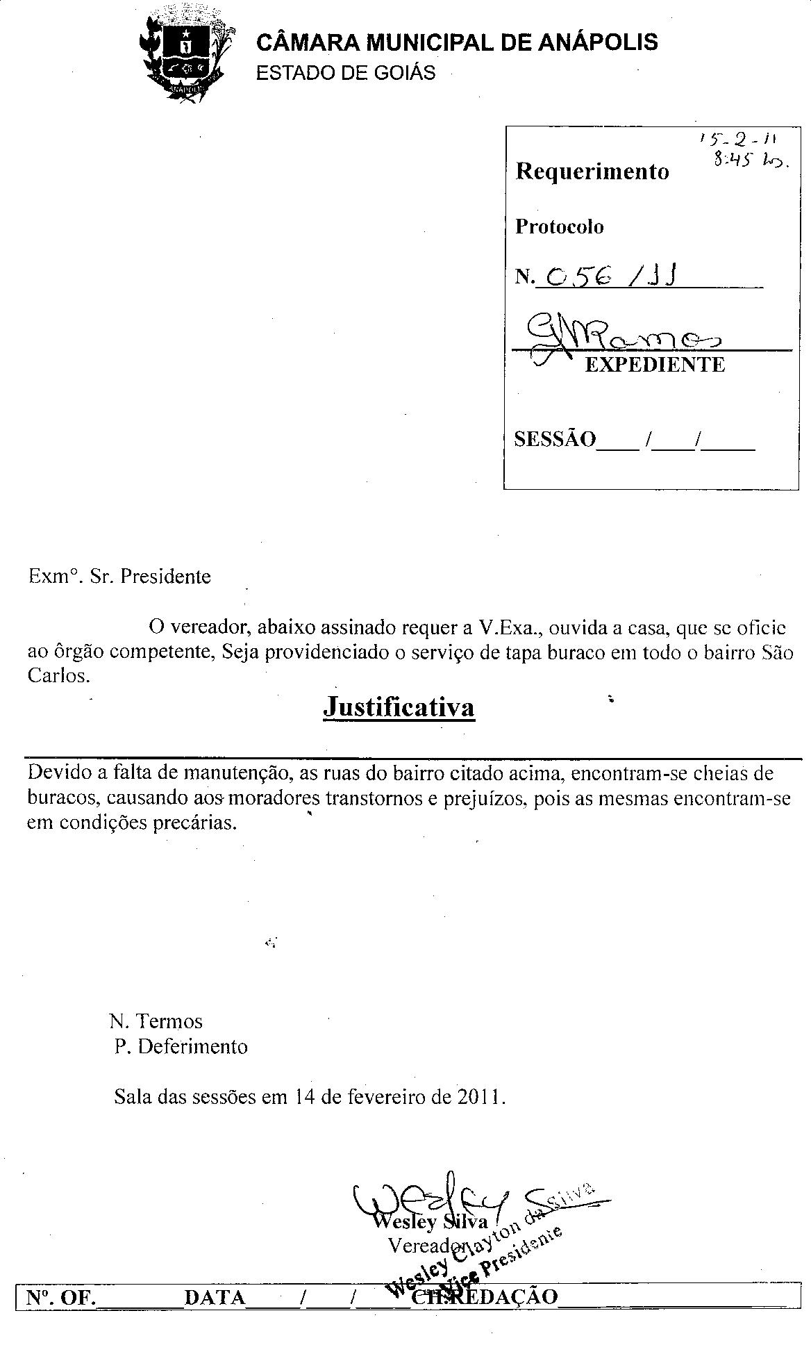 Ementa: O VEREADOR, ABAIXO ASSINADO REQUER A V.EXA., OUVIDA A CASA, QUE SE OFÍCIE AO ÓRGÃO COMPETENTE, SEJA PROVIDENCIADO O SERVIÇO DE TAPA BURACO EM TODO O BAIRRO SÃO CARLOS.