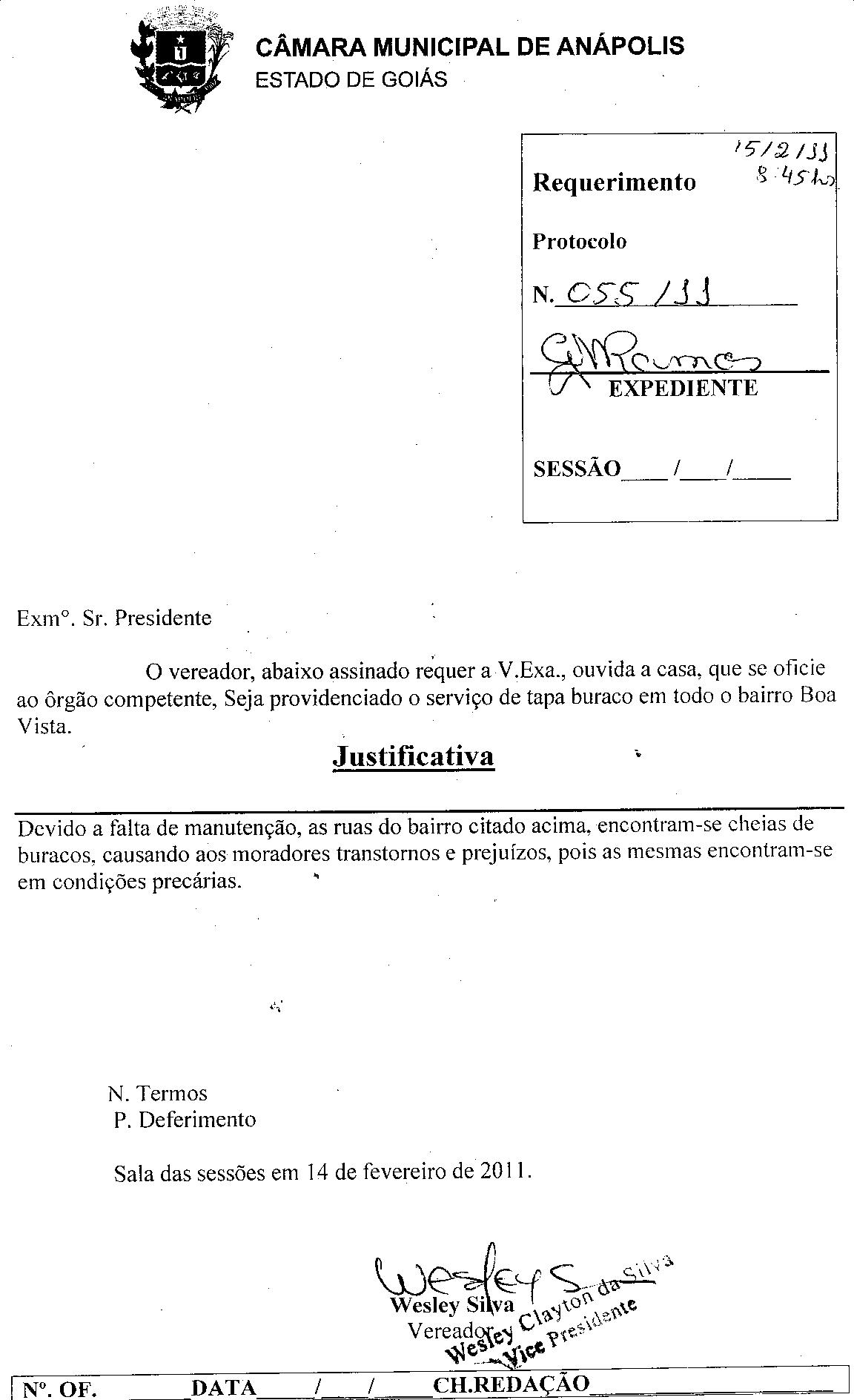 Ementa: O VEREADOR, ABAIXO ASSINADO REQUER A V. EXA., OUVIDA A CASA, QUE SE OFÍCIE AO ÓRGÃO COMPETENTE, SEJA PROVIDENCIADO O SERVIÇO DE TAPA BURACO EM TODO O BAIRRO BOA VISTA.