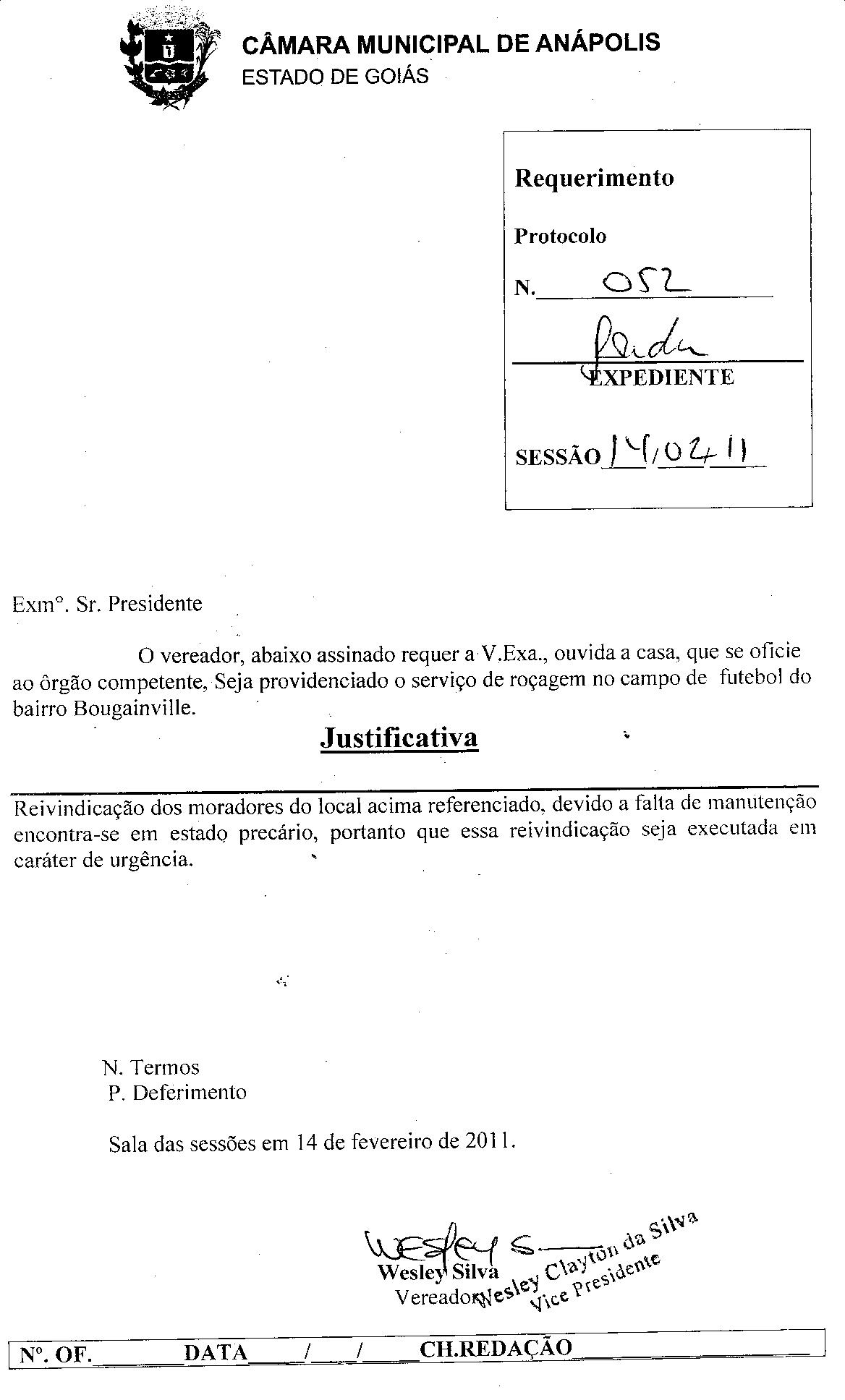 Ementa: O VEREADOR, ABAIXO ASSINADO REQUER A V.EXA., OUVIDA A CASA QUE SE OFÍCIE AO ÓRGÃO COMPETENTE, SEJA PROVIDENCIADO O SERVIÇO DE ROÇAGEM NO CAMPO DE FUTEBOL DO BAIRRO BOUGAINVILLE.