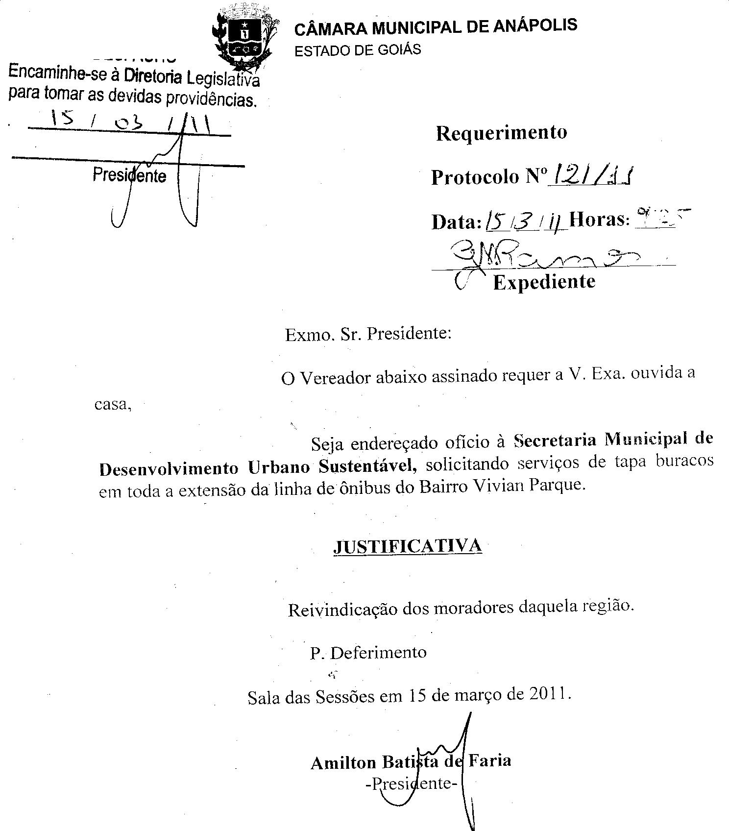 Ementa: O VEREADOR ABAIXO ASSINADO REQUER A V. EXA. OUVIDA A CASA, SEJA ENDEREÇADO OFÍCIO À SECRETARIA MUNICIPAL DE DESENVOLVIMENTO URBANO SUSTENTÁVEL, SOLICITANDO SERVIÇOS DE TAPA BURACOS EM TODA A EXTENSÃO DA LINHA DE ÔNIBUS DO BAIRRO VIVIAN PARQUE.