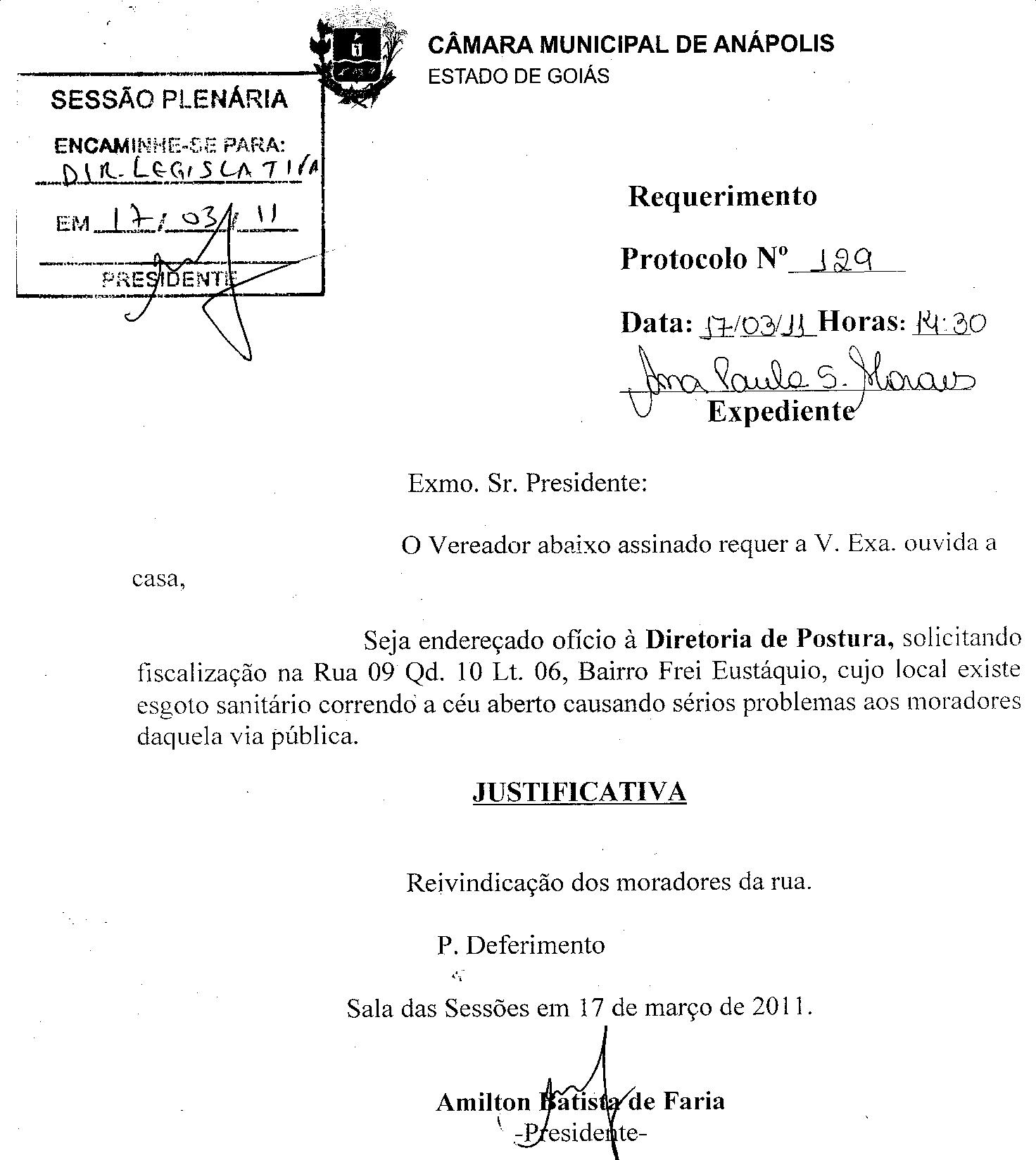 Ementa: O VEREADOR ABAIXO ASSINANDO REQUER A V. EXA. OUVIDA A CASA, SEJA ENDEREÇADO OFÍCIO À DIRETORIA DE POSTURA, SOLICITANDO FISCALIZAÇÃO NA RUA 09 Q.D. 10 LT.06, BAIRRO FREI EUSTÁQUIO, CUJO LOCAL EXISTE ESGOTO SANITÁRIO CORRENDO A CÉU ABERTO CAUSANDO SÉRIOS PROBLEMAS MORADORES DAQUELA VIA PÚBLICA.