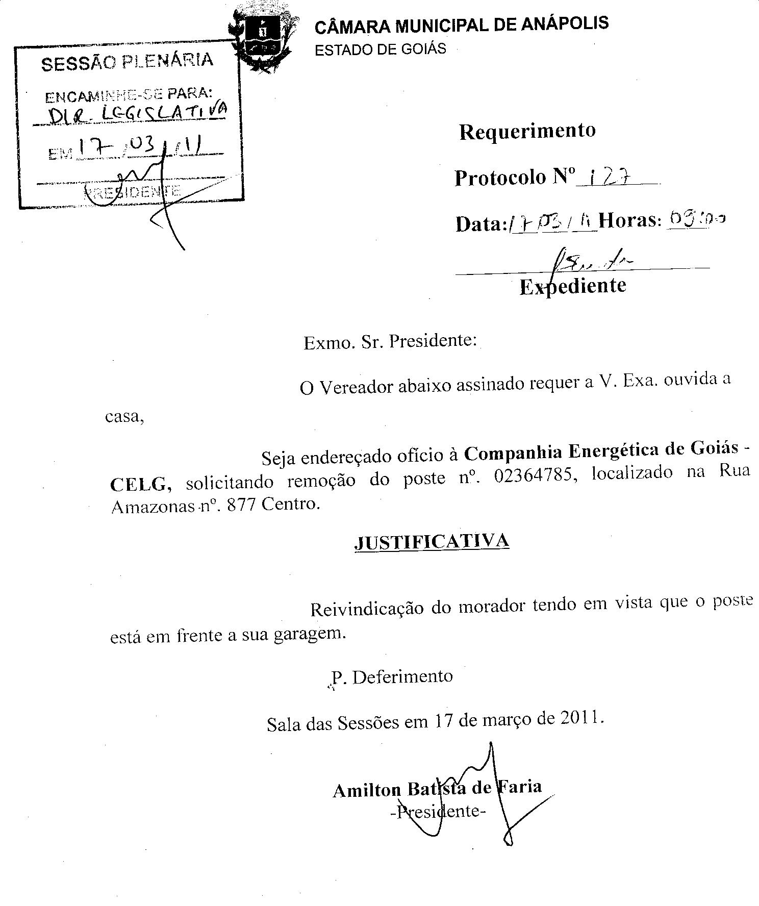 Ementa: O VEREADOR ABAIXO ASSINADO REQUER A V. EXA. OUVIDA A CASA, SEJA ENDEREÇADO OFÌCIO À COMPANHIA ENERGÉTICA DE GOIÁS - CELG, SOLICITANDO REMOÇÃO DO POSTE Nº 02364785, LOCALIZADO NA RUA AMAZONAS Nº 877 CENTRO.