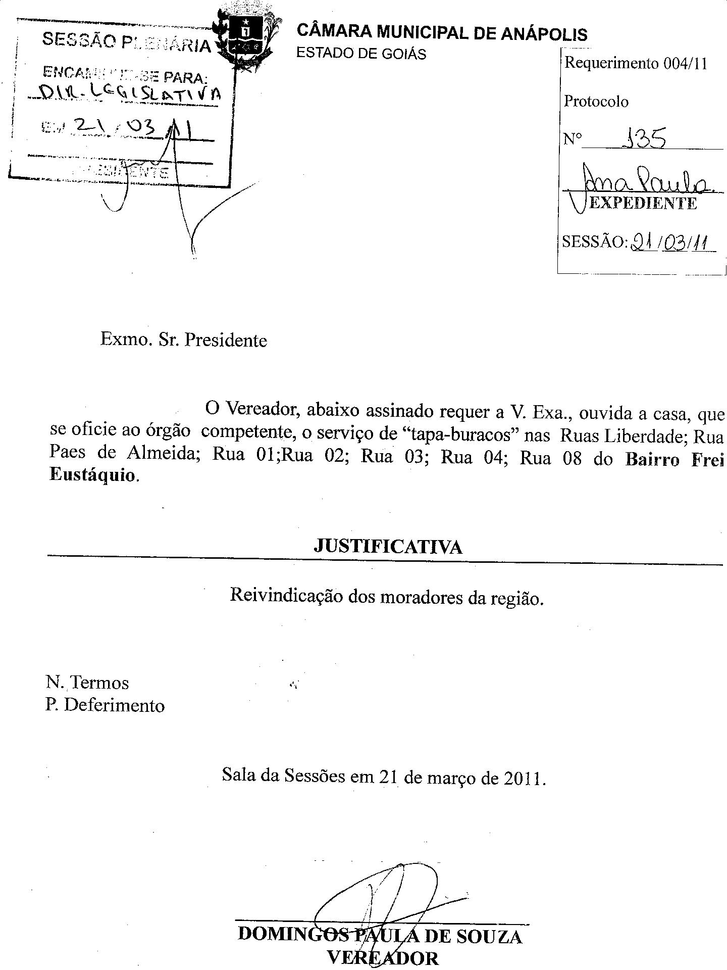 Ementa: O VEREADOR, ABAIXO ASSINADO REQUER A V. EXA., OUVIDA A CASA, QUE SE OFÍCIE AO ÓRGÃO COMPETENTE, O SERVIÇO DE "TAPA-BURACOS" NAS RUAS LIBERDADE; RUA PÃES DE AMEIDA; RUA 02; RUA 03; RUA 04; RUA 08 DO BAIRRO FREI EUSTÁQUIO.