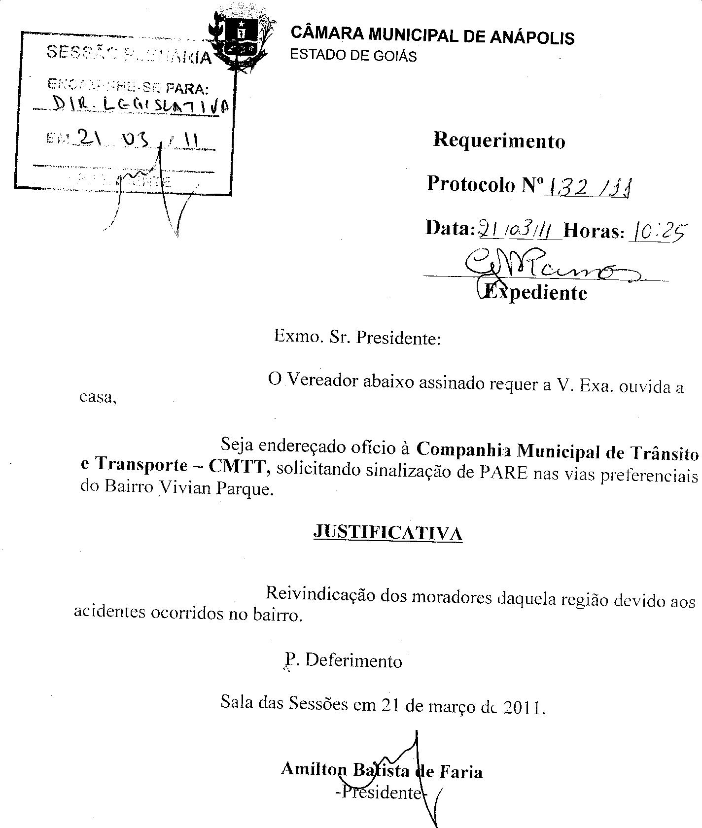 Ementa: O VEREADOR ABAIXO ASSINADO REQUER A V. EXA. OUVIDA A CASA, SEJA ENDEREÇADO OFÍCIO À COMPANHIA MUNICIPAL DE TRÂNSITO E TRANSPORTE - CMTT, SOLICITANDO SINALIZAÇÃO DE PARE NAS VIAS PREFERENCIAIS DO BAIRRO VIVIAN PARQUE.