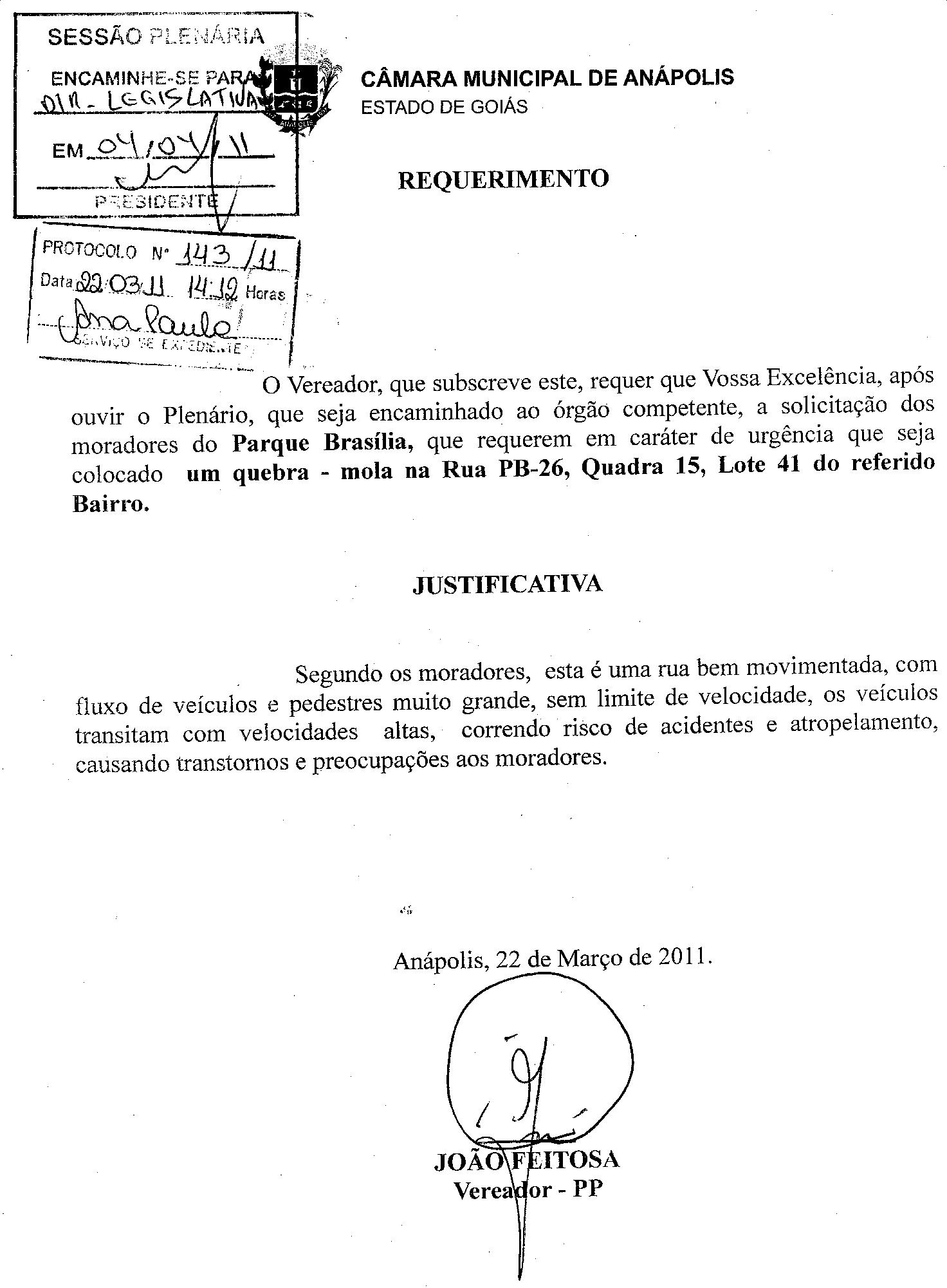 Ementa: O VEREADOR, QUE SUBSCREVE ESTE,REQUER QUE VOSSA EXCELÊNCIA, APÓS OUVIR O PLENÁRIO, QUE SEJA ENCAMINHADO AO ÓRGÃO COMPETENTE, A SOLICITAÇÃO DOS MORADORES DO PARQUE BRASÍLIA, QUE REQUEREM EM CARÁTER DE URGÊNCIA QUE SEJA COLOCADO UM QUEBRA - MOLA NA RUA PB-26, QUADRA 15, LOTE 41 DO REFERIDO BAIRRO.