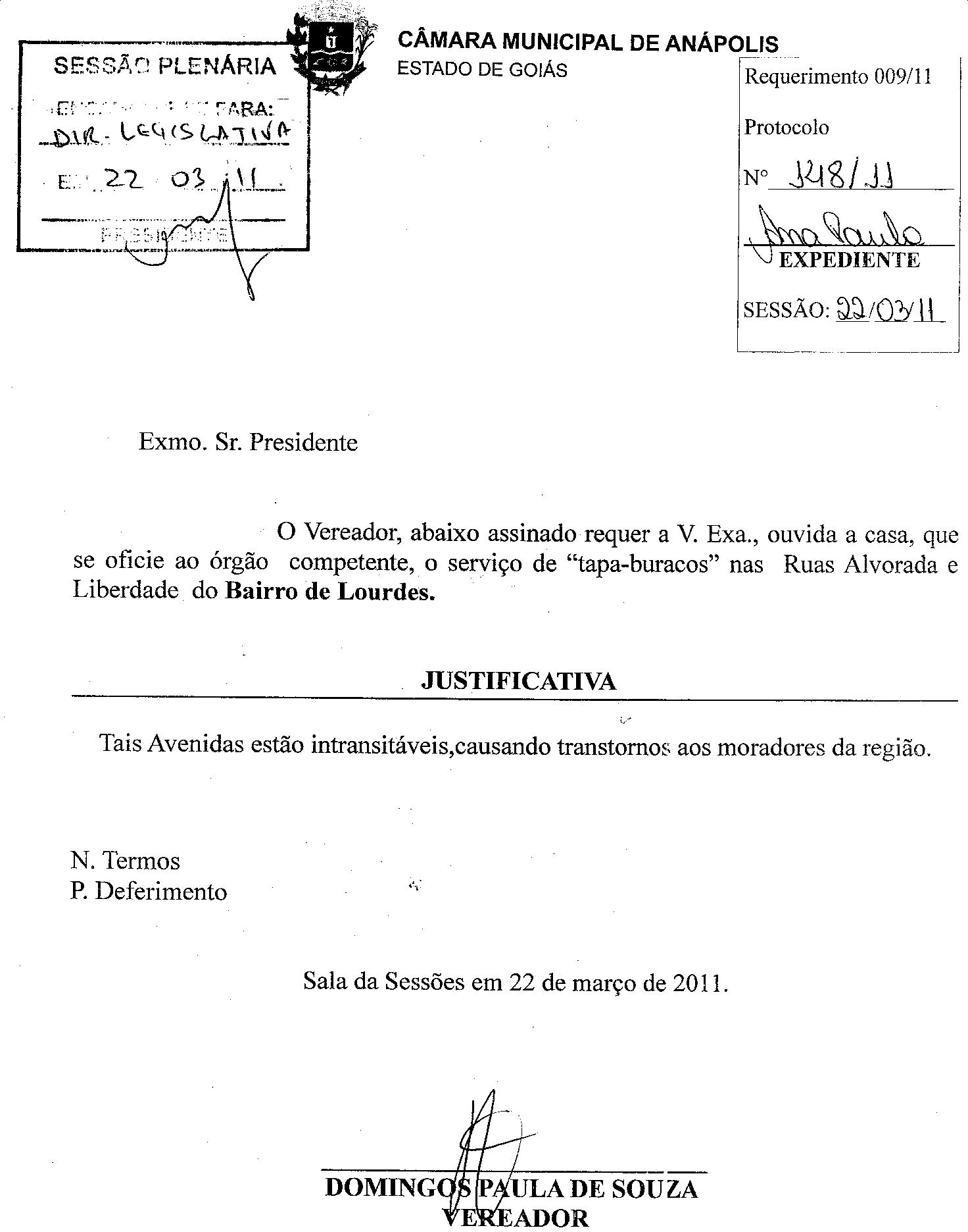 Ementa: O VEREADOR, ABAIXO ASSINANDO REQUER A V. EXA., OUVIDA A CASA, QUE SE OFÍCIE AO ÓRGÃO COMPETENTE, O SERVIÇO DE "TAPA-BURACOS" NAS RUAS ALVORADA E LIBERDADE DO BAIRRO DE LOURDES.