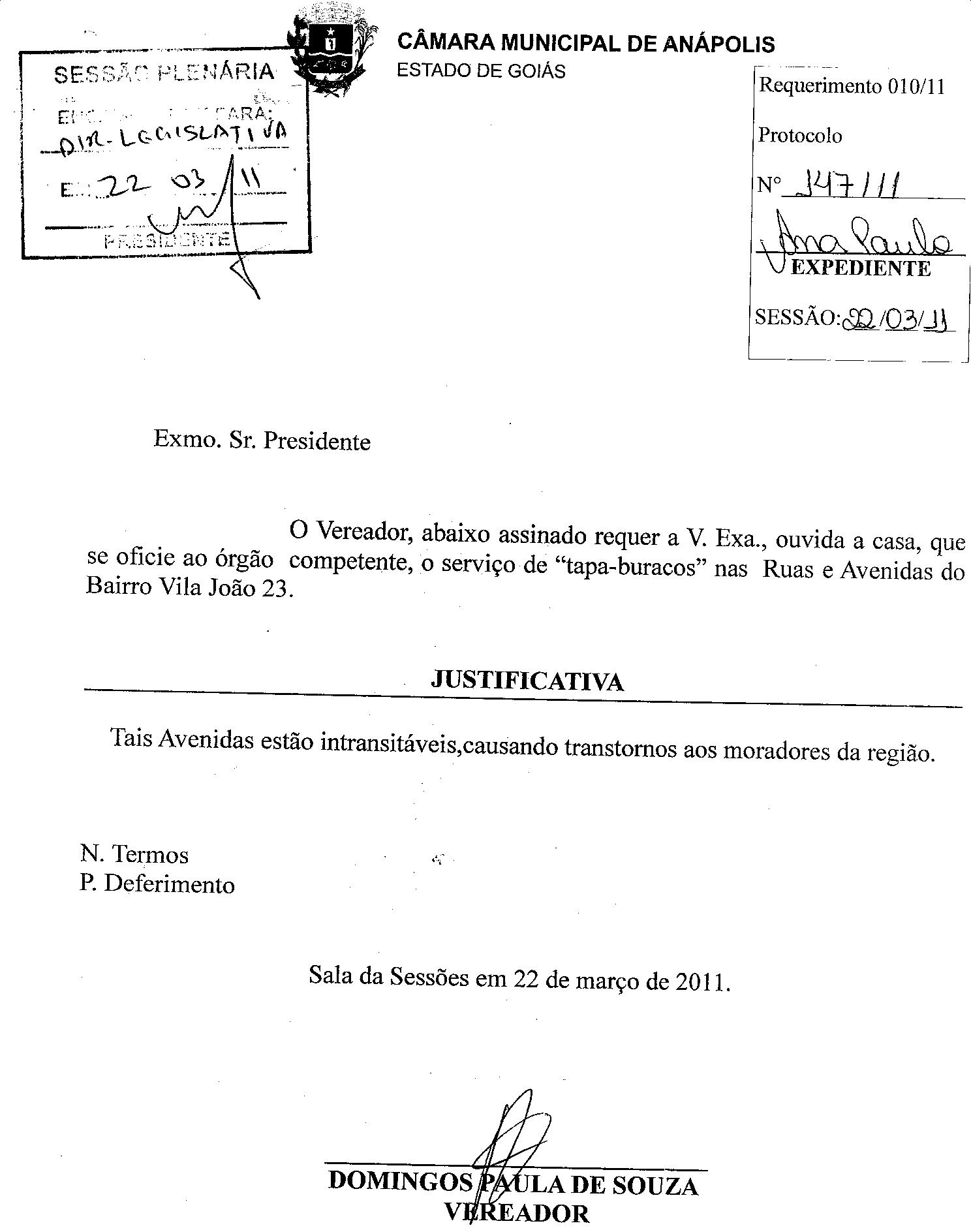 Ementa: O VEREADOR, ABAIXO ASSINADO REQUER A V. EXA., OUVIDA A CASA, QUE SE OFÍCIE AO ÓRGÃO COMPETENTE, O SERVIÇO DE "TAPA- BURACOS" NAS RUAS E AVENIDAS DO BAIRRO VILA JOÃO 23.