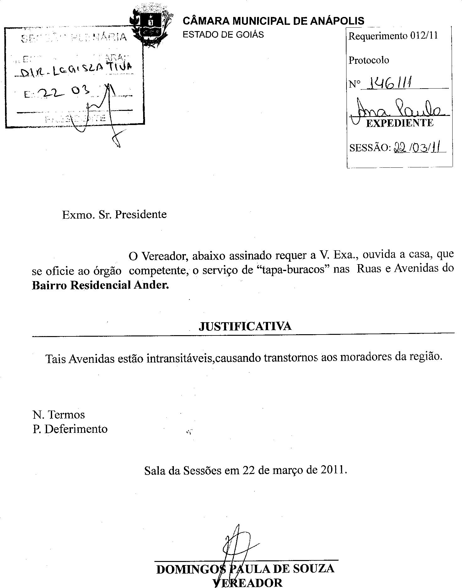 Ementa: O VEREADOR, ABAIXO ASSINADO REQUER A V. EXA., OUVIDA A CASA, QUE SE OFÍCIE AO ÓRGÃO COMPETENTE, O SERVIÇO DE "TAPA-BURACOS" NAS RUAS E AVENIDAS DO BAIRRO RESIDENCIAL ANDER.