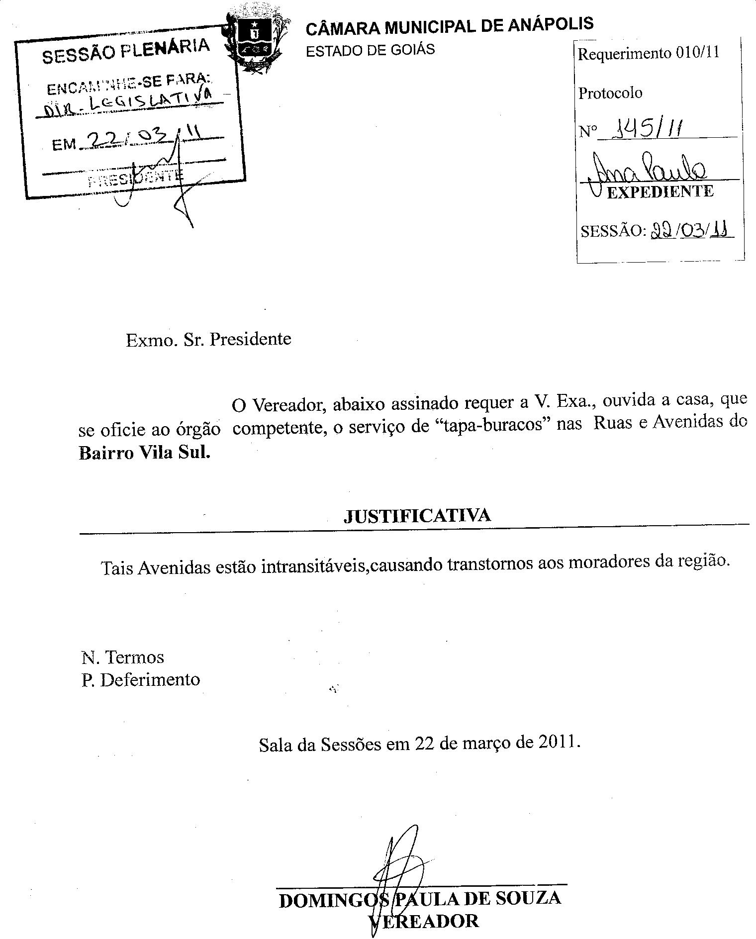 Ementa: O VEREADOR, ABAIXO ASSINADO REQUER A V. EXA., OUVIDA A CASA, QUE SE OFÍCIE AO ÓRGÃO COMPETENTE, O SERVIÇO DE "TAPA-BURACOS" NAS RUAS E AVENIDAS DO BAIRRO VILA SUL.