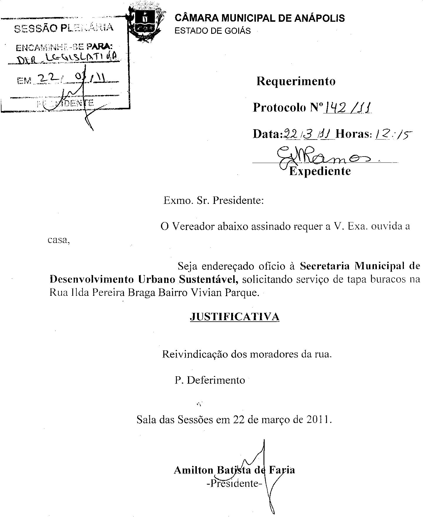 Ementa: O VEREADOR ABAIXO ASSINADO REQUER A V. EXA. OUVIDA A CASA, SEJA ENDEREÇADO OFÍCIO À SECRETARIA MUNICIPAL DE DESENVOLVIMENTO URBANO SUSTENTÁVEL, SOLICITANDO SERVIÇO DE TAPA BURACOS NA RUA ILDA PEREIRA BRAGA BAIRRO VIVIAN PARQUE.