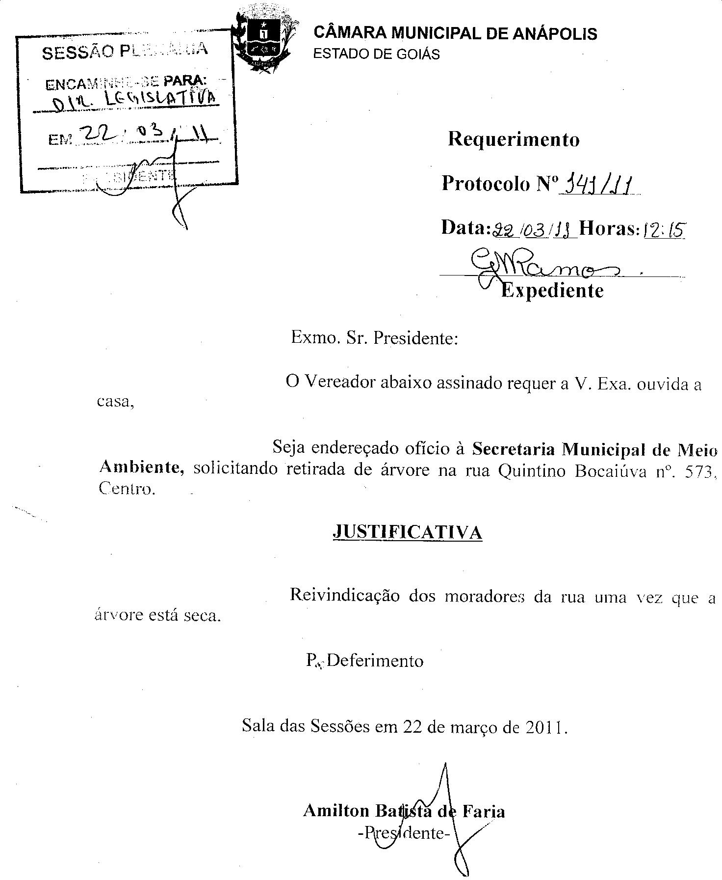 Ementa: O VEREADOR ABAIXO ASSINADO REQUER A V. EXA. OUVIDA A CASA, SEJA ENDEREÇADO OFÍCIO Á SECRETARIA MUNICIPAL DE MEIO AMBIENTE, SOLICITANDO RETIRADA DE ÁRVORE NA RUA QUINTINO BOCAIÚVA Nº 573, CENTRO.