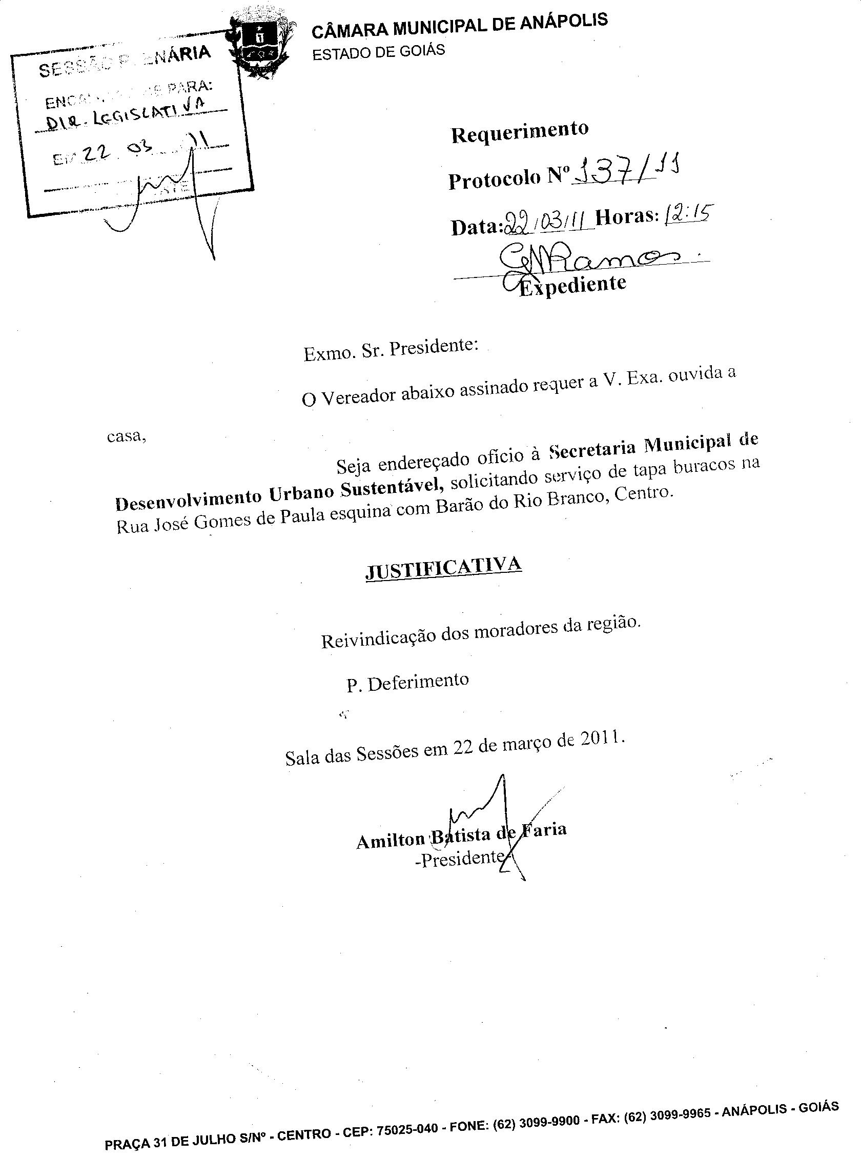 Ementa: O VEREADOR ABAIXO ASSINADO REQUER A V. EXA. OUVIDA A CASA, SEJA ENDEREÇADO OFÍCIO À SECRETARIA MUNICIPAL DE DESENVOLVIMENTO URBANO SUSTENTÁVEL, SOLICITANDO SERVIÇO DE TAPA BURACOS NA RUA JOSÉ GOMES DE PAULA ESQUINA COM BARÃO DO RIO BRANCO, CENTRO.