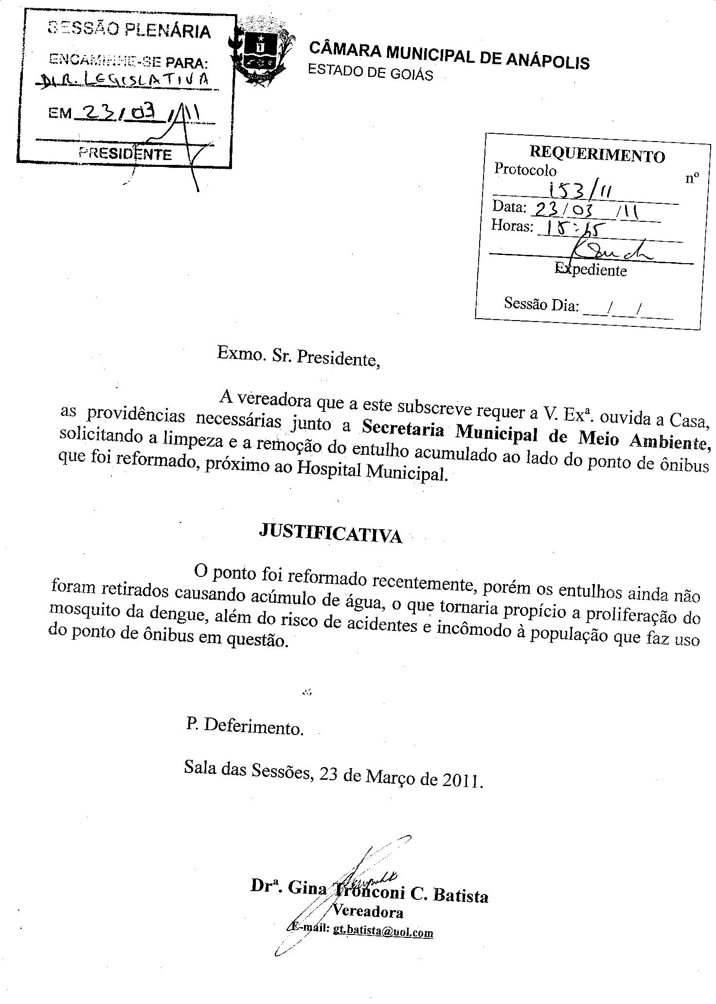 Ementa: A VEREADORA QUE A ESTE SUBSCREVE REQUER A V. EXª. OUVIDA A CASA, AS PROVIDÊNCIAS NECESSÁRIAS JUNTO A SECRETARIA MUNICIPAL DE MEIO AMBIENTE, SOLICITANDO A LIMPEZA E A REMOÇÃO DO ENTULHO ACUMULADO AO LADO DO PONTO DE ÔNIBUS QUE FOI REFORMADO, PRÓXIMO AO HOSPITAL MUNICIPAL.