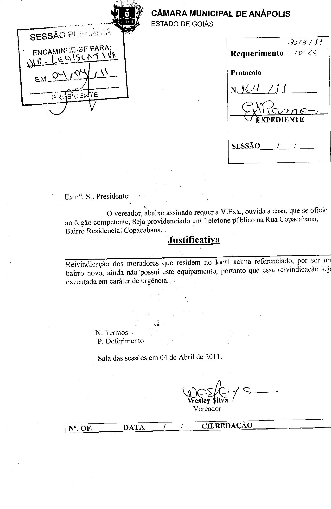 Ementa: O VEREADOR, ABAIXO ASSINADO REQUER A V.EXA.,OUVIDA A CASA,QUE SE OFÍCIE AO ÓRGÃO COMPETENTE, SEJA PROVIDENCIADO UM TELEFONE PÚBLICO NA RUA COPACABANA, BAIRRO RESIDENCIAL COPACABANA.