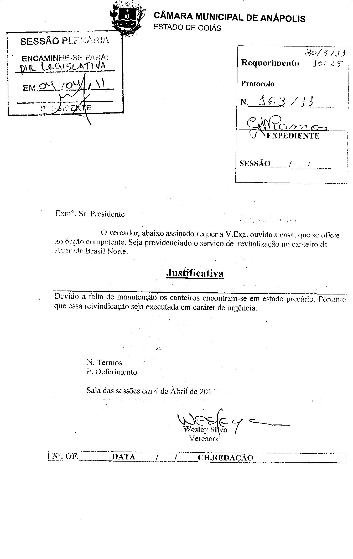 Ementa: O VEREADOR,ABAIXO ASSINADO REQUER A V.EXA.OUVIDA A CASA,QUE SE OFÍCIE AO ÓRGÃO COMPETENTE, SEJA PROVIDENCIADO O SERVIÇO DE REVITALIZAÇÃO NO CANTEIRO DA AVENIDA BRASIL NORTE.