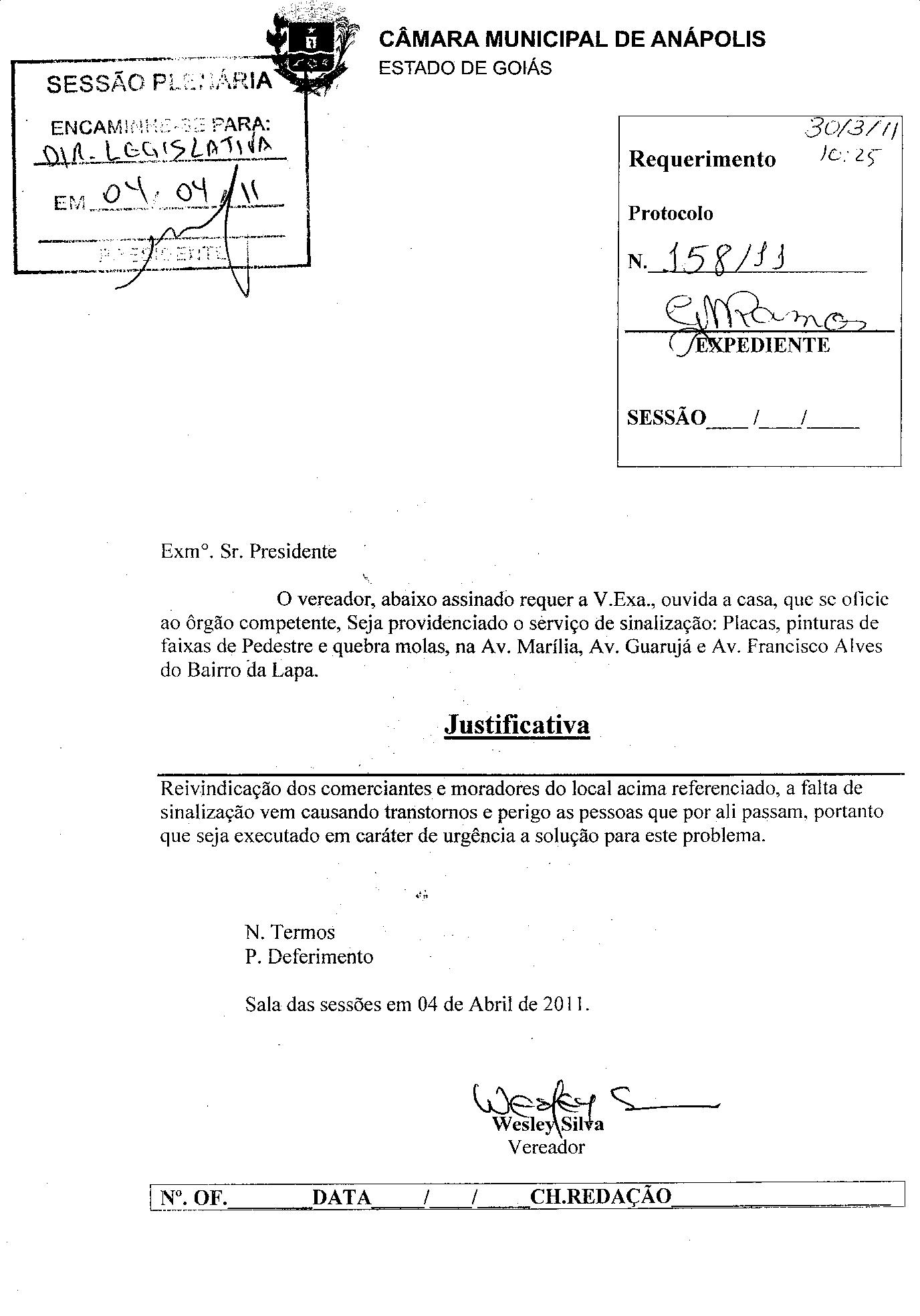Ementa: O VEREADOR, ABAIXO ASSINADO REQUER A V.EXA., OUVIDA A CASA, QUE SE OFÍCIE AO ÓRGÃO COMPETENTE, SEJA PROVIDENCIADO O SERVIÇO DE SINALIZAÇÃO: PLACAS, PINTURAS DE FAIXAS DE PEDESTRE E QUEBRA MOLAS, NA AV. MARÍLIA, AV.GUARUJÁ E AV. FRANCISCO ALVES DO BAIRRO DA LAPA.