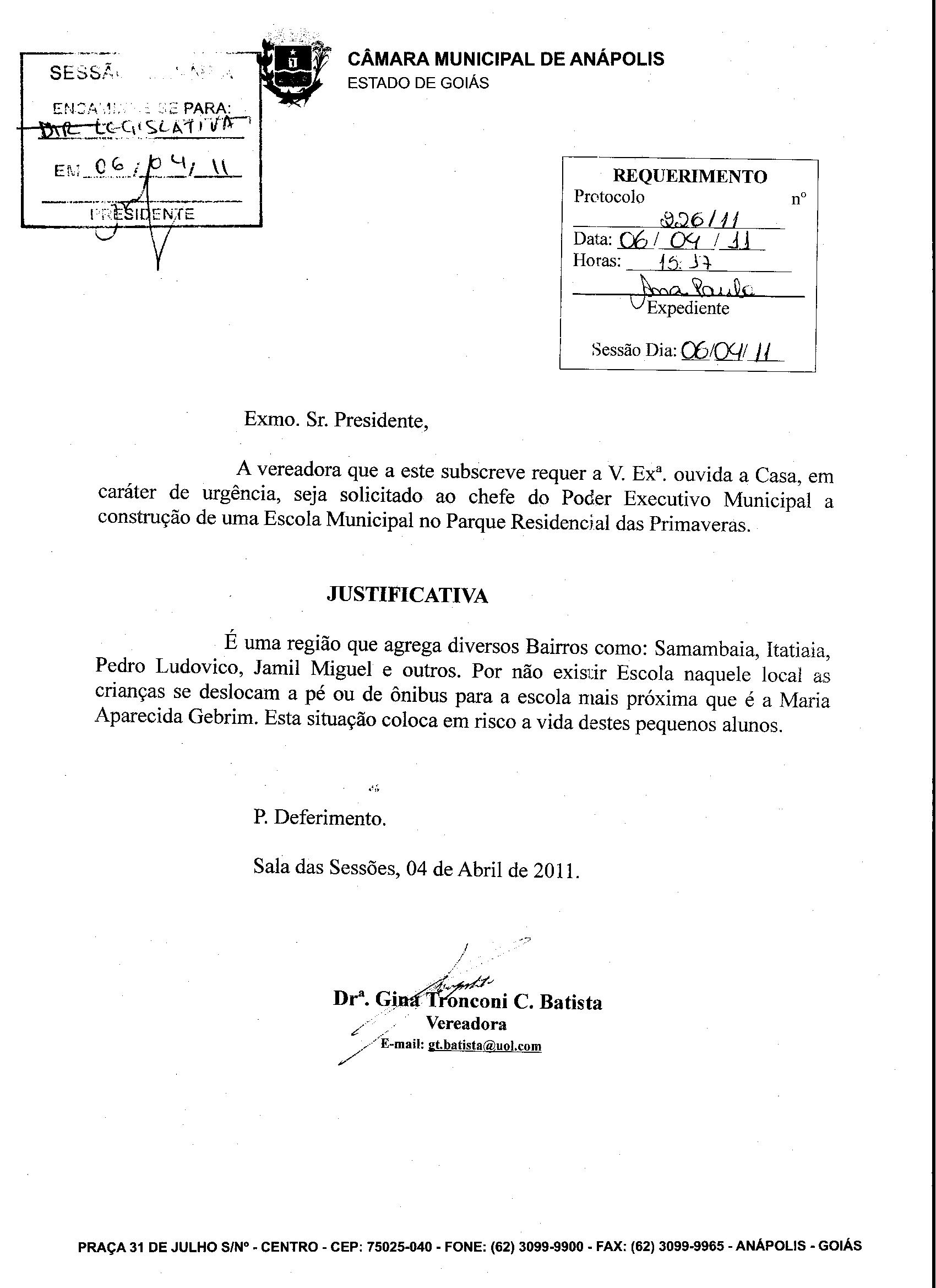 Ementa: A VEREADORA QUE A ESTE SUBSCREVE REQUER A V. EXª. OUVIDA A CASA, EM CARÁTER DE URGÊNCIA, SEJA SOLICITANDO AO CHEFE DO PODER EXECUTIVO MUNICIPAL A CONSTRUÇÃO DE UMA ESCOLA MUNICIPAL NO PARQUE RESIDENCIAL DAS PRIMAVERAS.